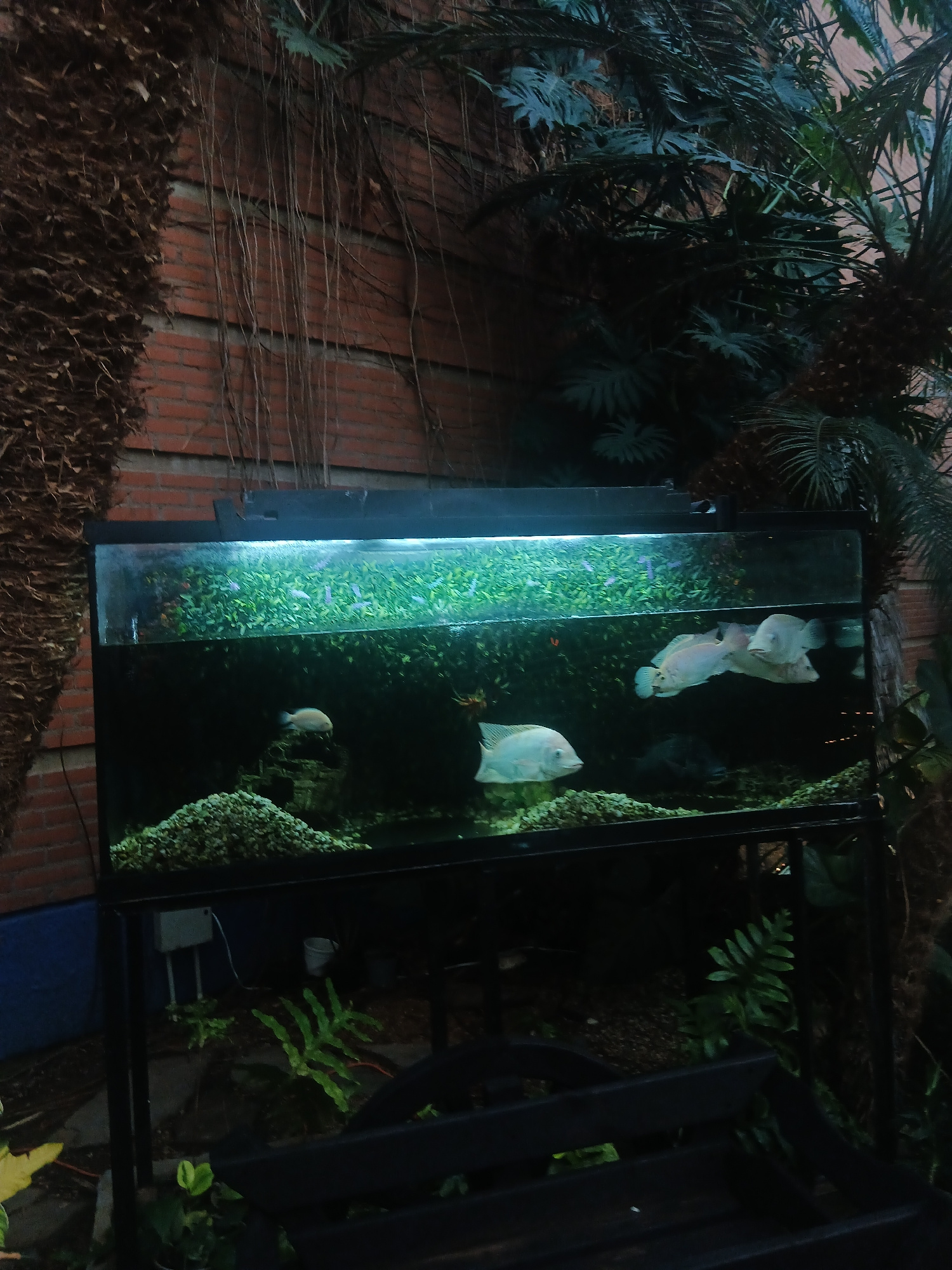 The image shows a glass aquarium situated amongst dense foliage, possibly an indoor or semi-outdoor environment. The aquarium contains several light-colored fish. The surrounding environment includes…read more