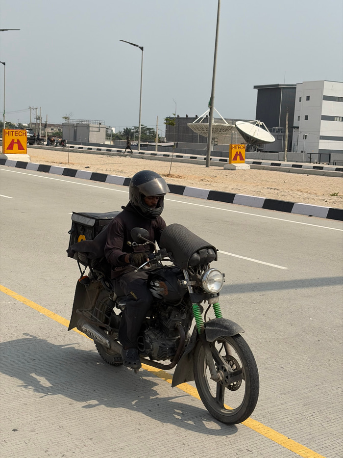 A male individual is depicted riding a dark Olink motorcycle on a paved road in Alaguntan, Nigeria. The rider wears a black full-face helmet with a dark visor, a dark long-sleeved shirt with a "Cainia…read more