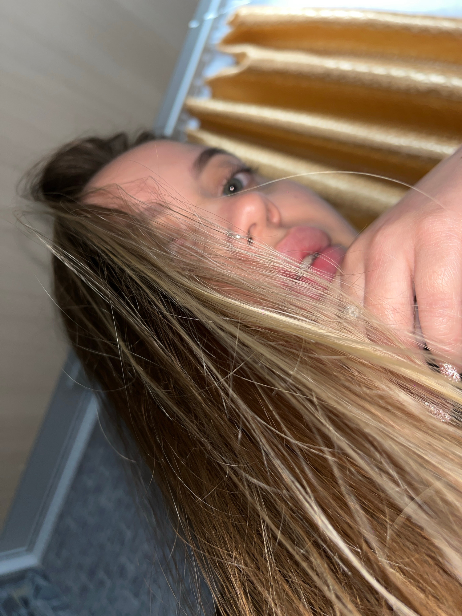 A close-up, upside-down image features a person with long, blonde hair with brown roots. The person's face is partially visible, with one eye, a nose piercing, and a glimpse of the mouth and tongue. A…read more