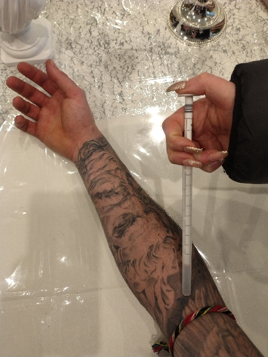 This indoor image, taken in Crauthem, Luxembourg, shows a close-up view of two arms engaged in an activity. The primary subject is a person's forearm, extensively covered with detailed black and greyβ¦read more