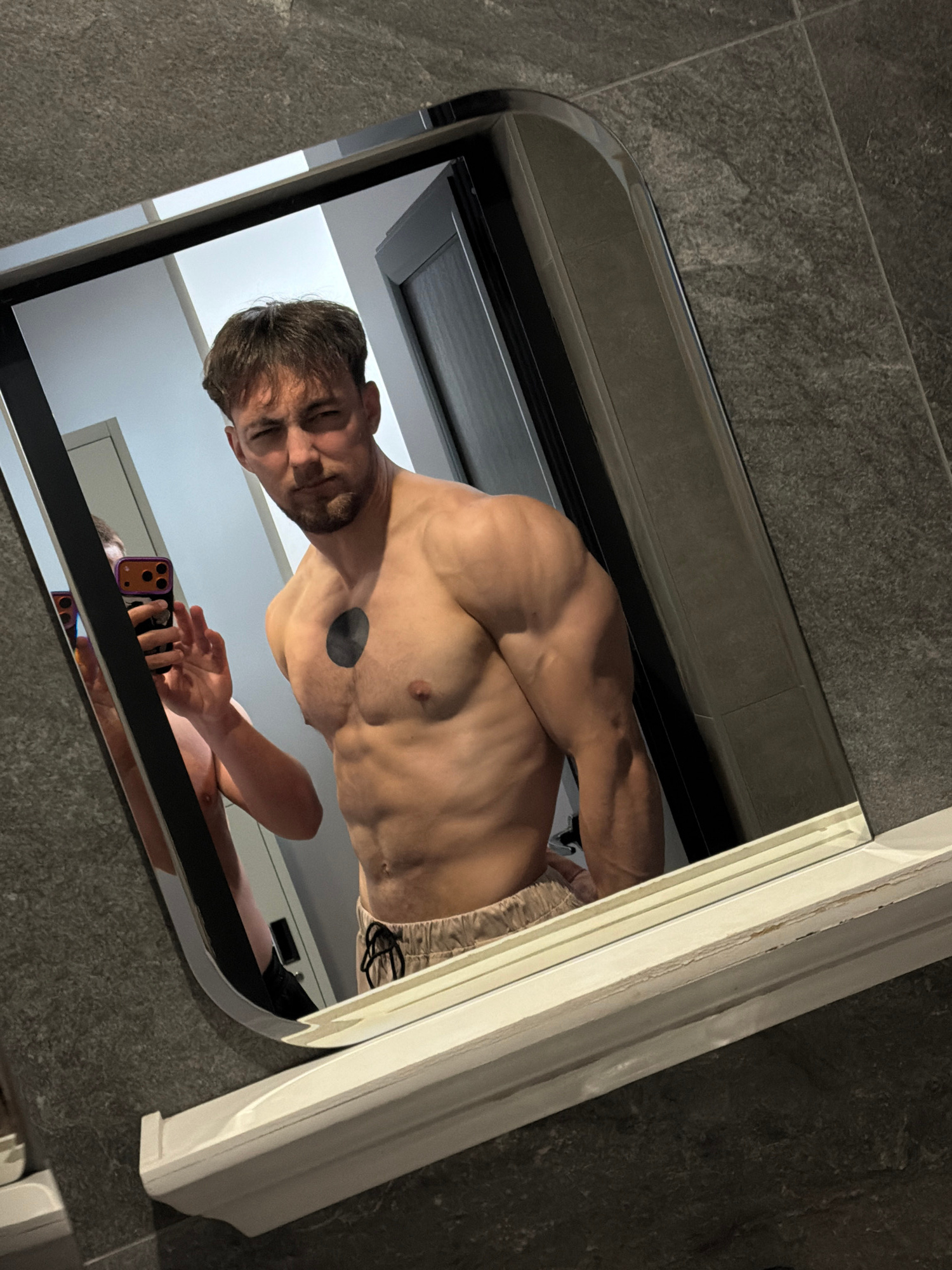A muscular man is visible in a mirror selfie. He has short brown hair and a beard. He is shirtless and wearing shorts, with a circular tattoo on his chest. His right hand is holding a cell phone and i…read more
