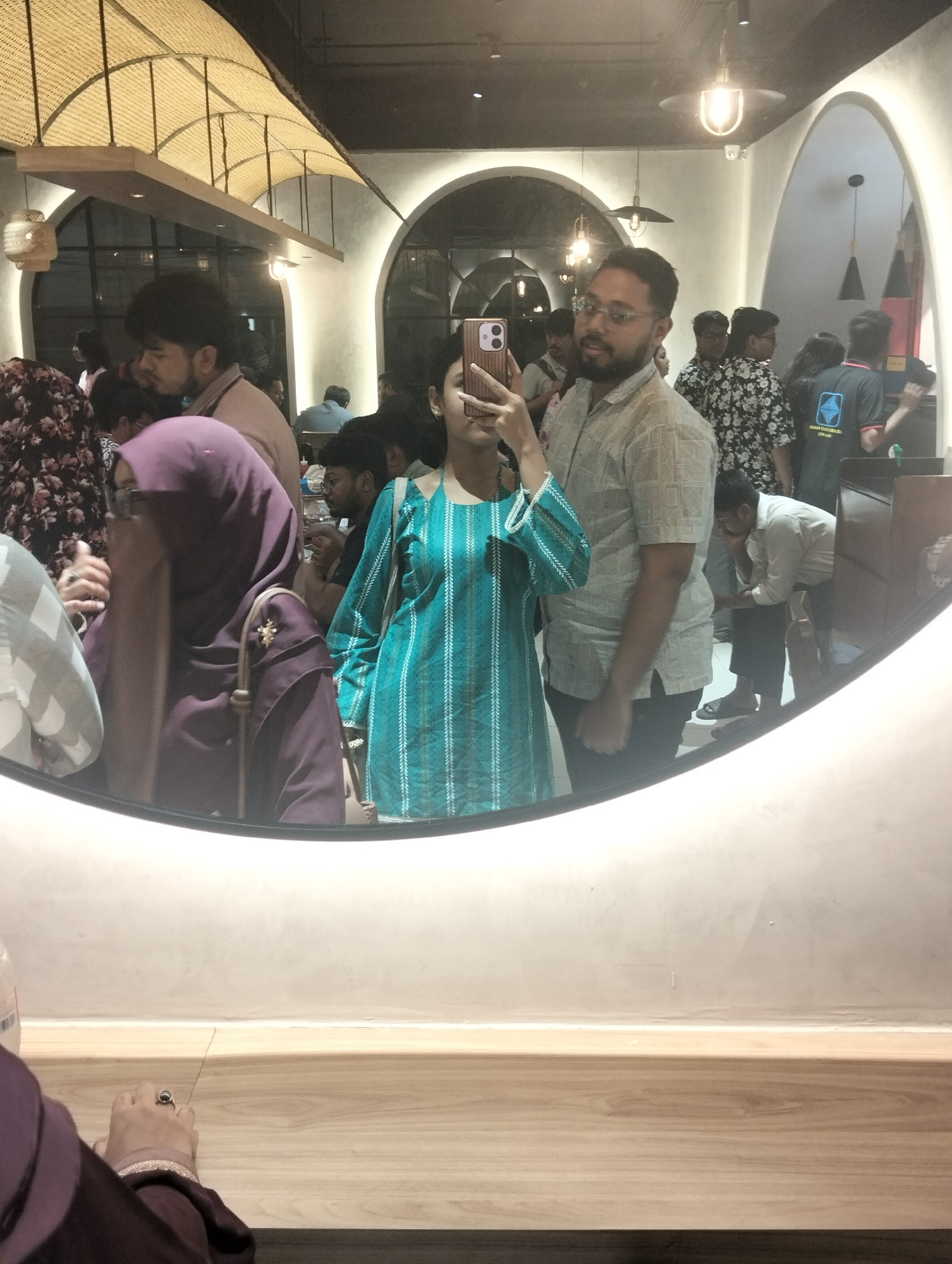 A mirror selfie reflects an indoor scene filled with people. The selfie is taken by a person wearing a turquoise and white patterned top, holding a tan-colored smartphone. Behind this person stands a…read more