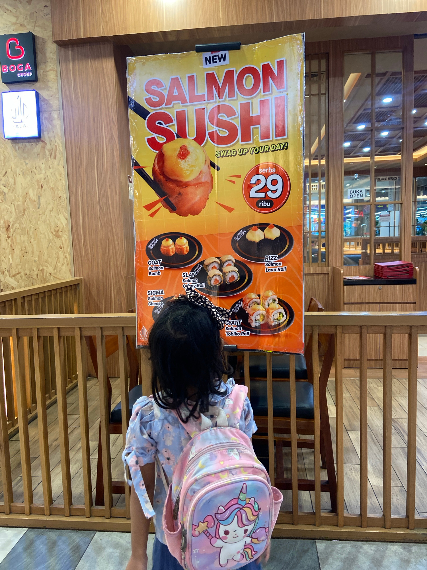 The image captures an indoor scene, likely a restaurant or food court in Surabaya, Indonesia. The dominant feature is a large, brightly colored promotional banner for sushi, positioned vertically on t…read more