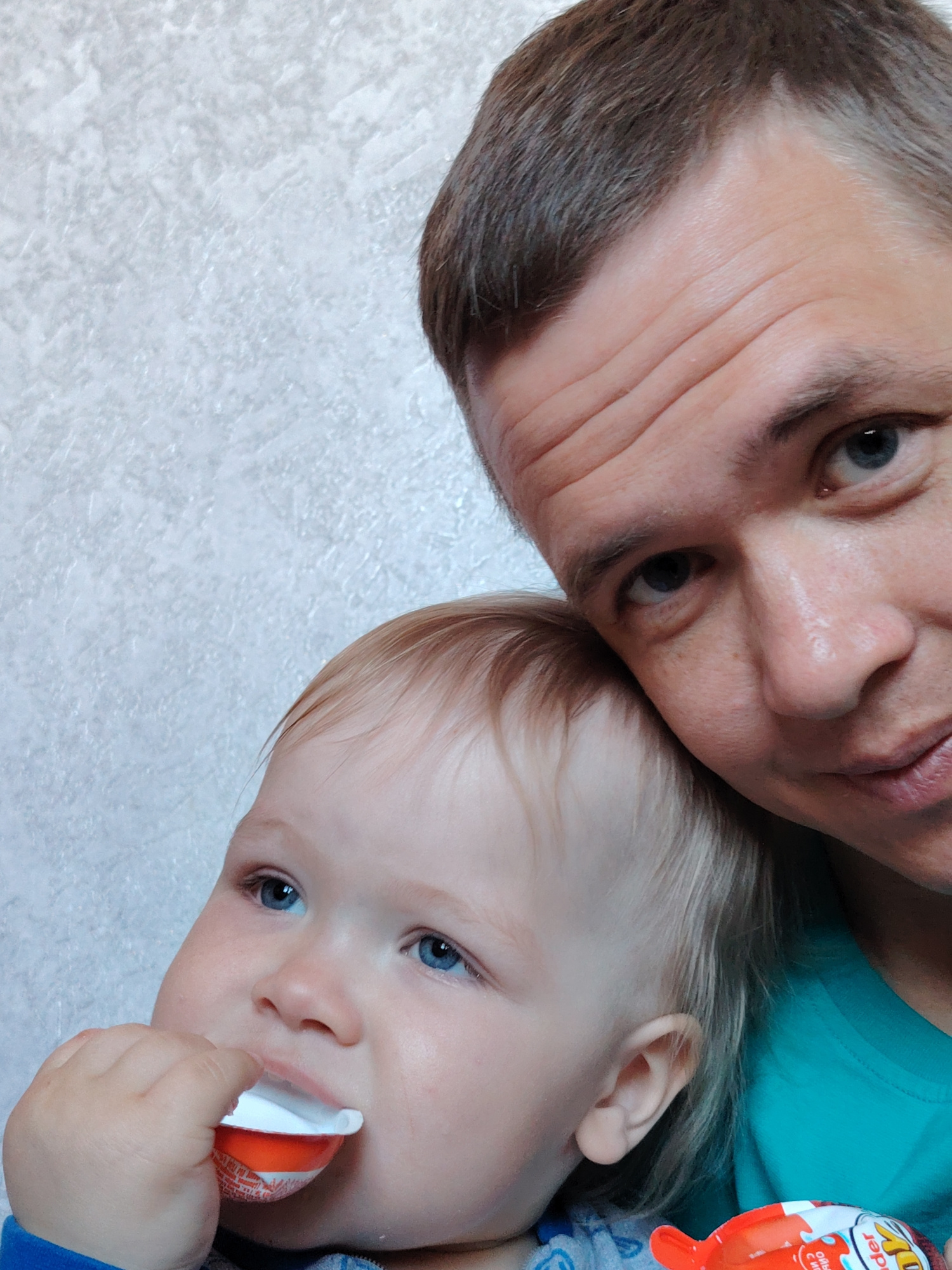 A close-up selfie shows a man and a young child indoors, likely in Chaikovsky, Russia. The man, positioned in the upper right, has short light brown hair, blue eyes, and visible lines on his forehead,…read more