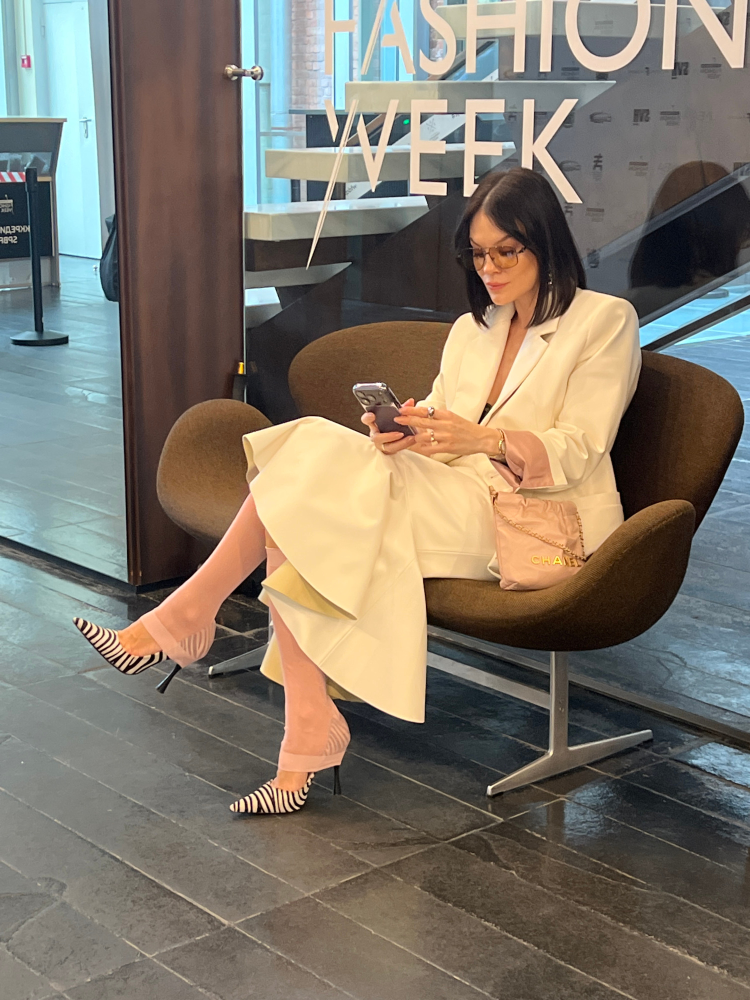 A woman is seated in a brown swivel chair at a fashion event. She is wearing a white pantsuit with pink accents, pink stockings, and zebra-striped high heels. She is holding a smartphone. A pink Chane…read more
