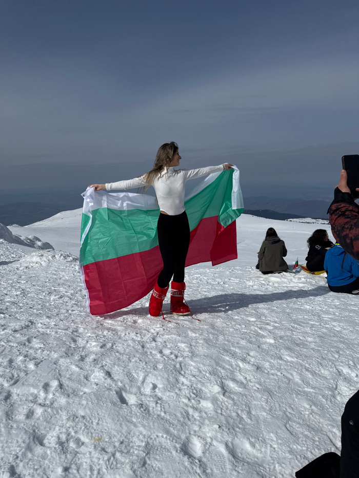 The scene depicts a snow-covered mountain landscape near the city of Bistritsa, Bulgaria, under a hazy, light blue sky. A female subject, with long light-colored hair, stands upright in the center-lefβ¦read more
