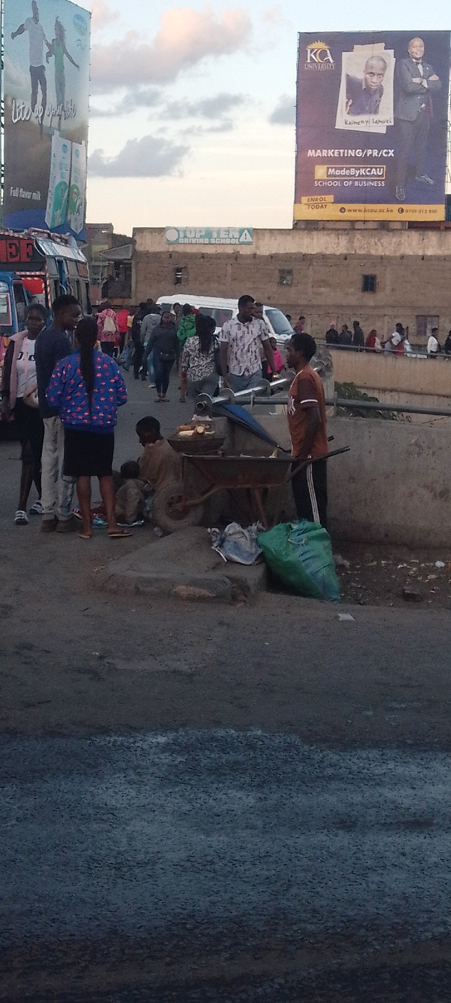 The image depicts a busy street scene in Nairobi, Kenya. Several people are gathered near a street vendor, who appears to be selling cooked corn. The vendor is standing next to a wheelbarrow, and a gr…read more