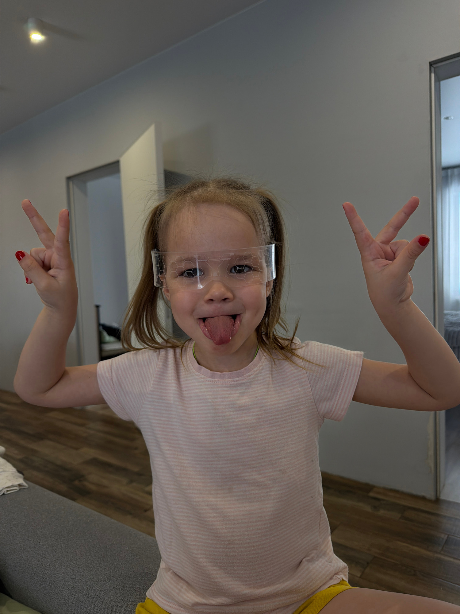 A young child with blonde hair, wearing a striped pink shirt, yellow shorts, and clear plastic glasses with a hexagonal pattern, is making a silly face with her tongue sticking out. She is giving a "pā¦read more