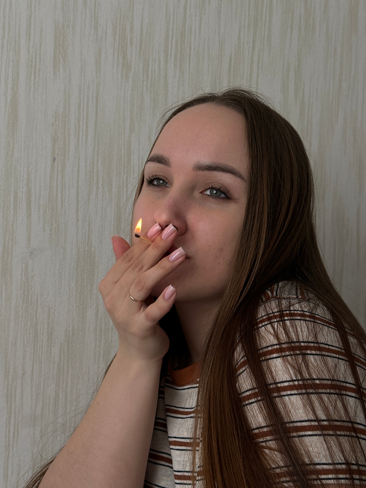 A young woman with long brown hair and light skin holds a lit match close to her face. She is wearing a striped shirt and a ring on her finger. The background is a light-colored wall. There is no veri…read more