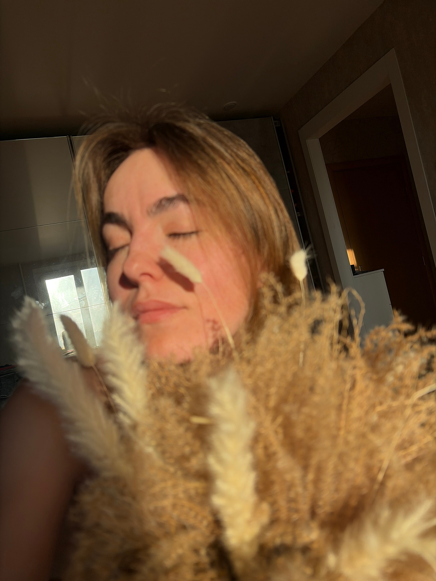 The image shows a woman holding a bouquet of dried flowers in an interior space. The location is likely a room in a building in Izhevsk, Russia. The woman has light brown hair and closed eyes. Her fac…read more
