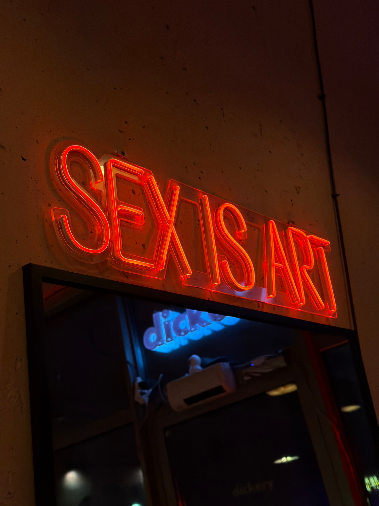 A neon sign spelling "SEX SHOP" is illuminated in red and affixed to a wall in Gdańsk, Poland. The sign is mounted vertically. To the right of the sign is a window with a dark interior. Within the win…read more