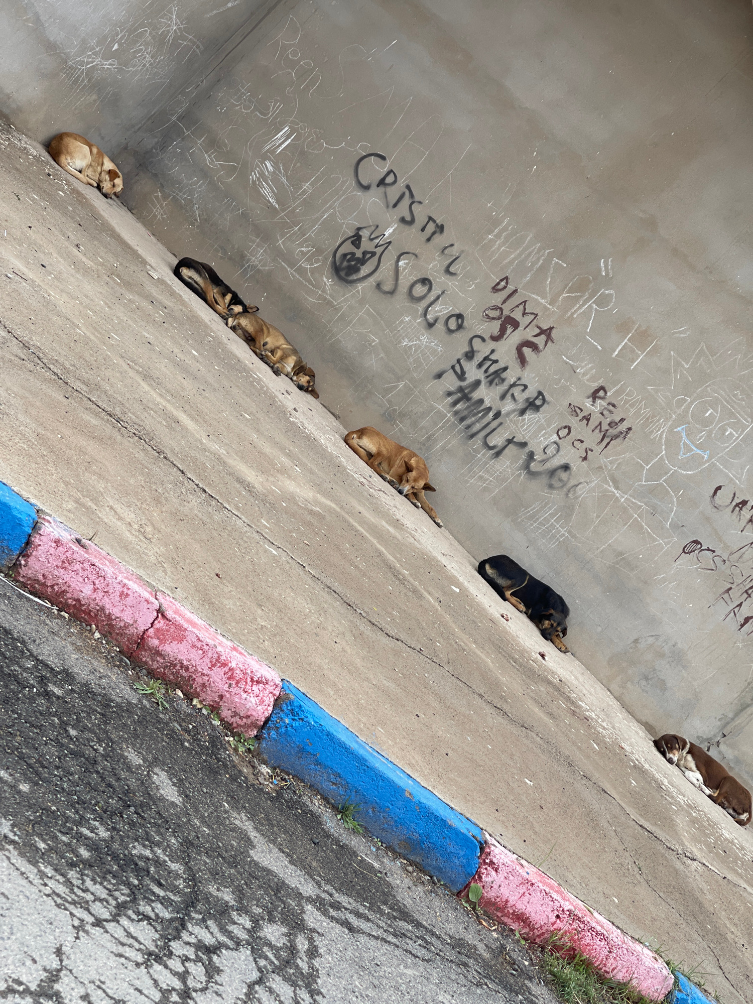 Six dogs are lying on a concrete embankment next to a curb painted blue and pink. The embankment is angled steeply upwards, with graffiti covering the concrete wall behind the dogs. The location is Sa…read more