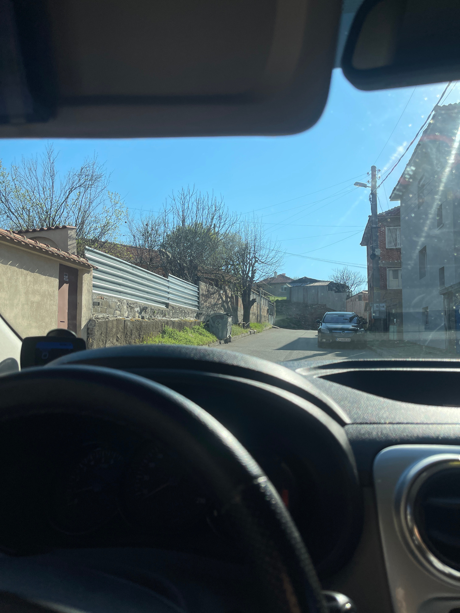 The view from inside a vehicle captures a residential street in Sliven, Bulgaria. Outside, there is a narrow road lined with houses and bare trees. One car is visible further down the street. The weat…read more
