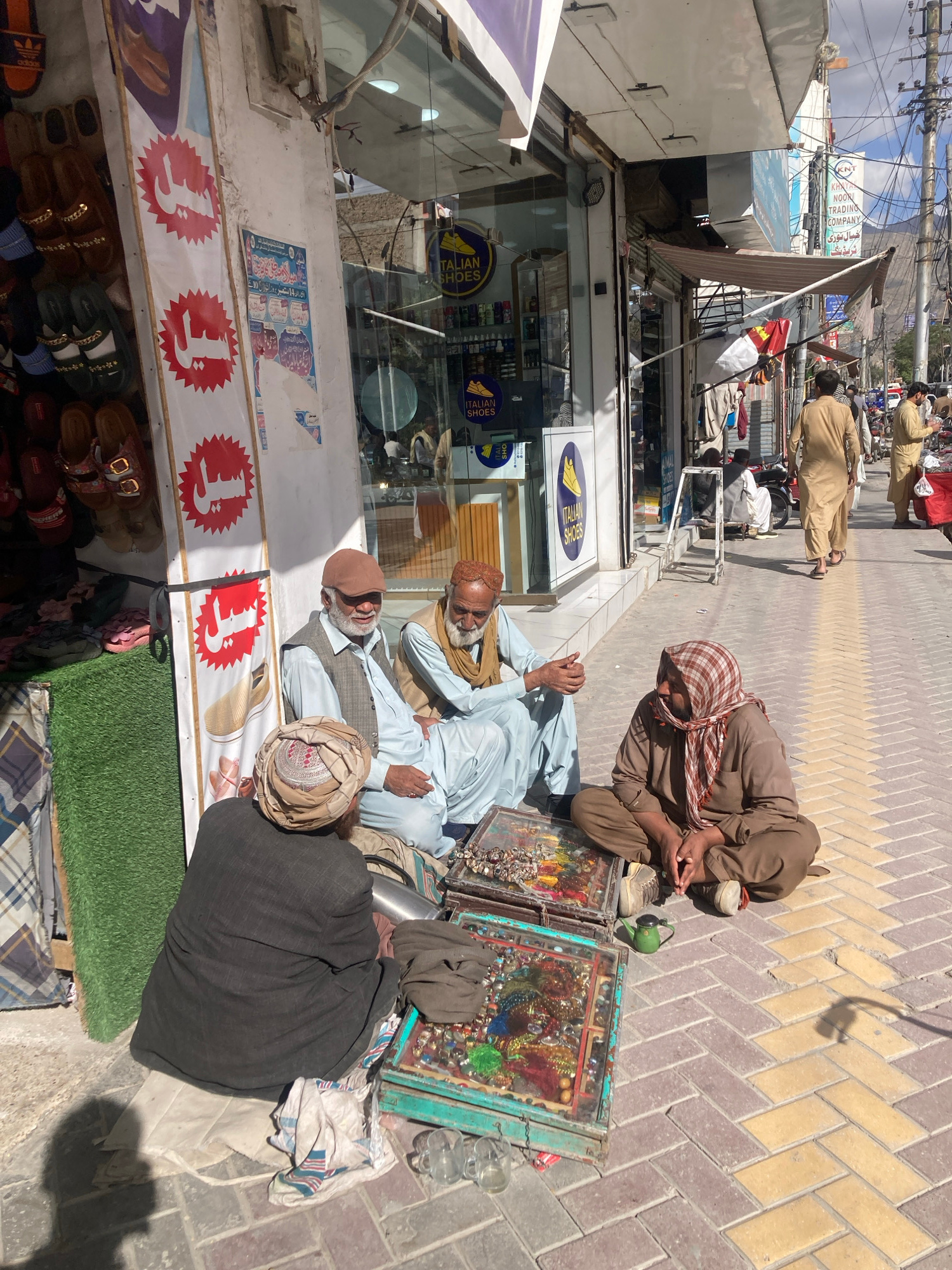 The image shows a street scene in Quetta City Tehsil, Pakistan. On the right side of the image, three men are sitting on the pavement next to what appears to be their wares, two rectangular frames fil…read more