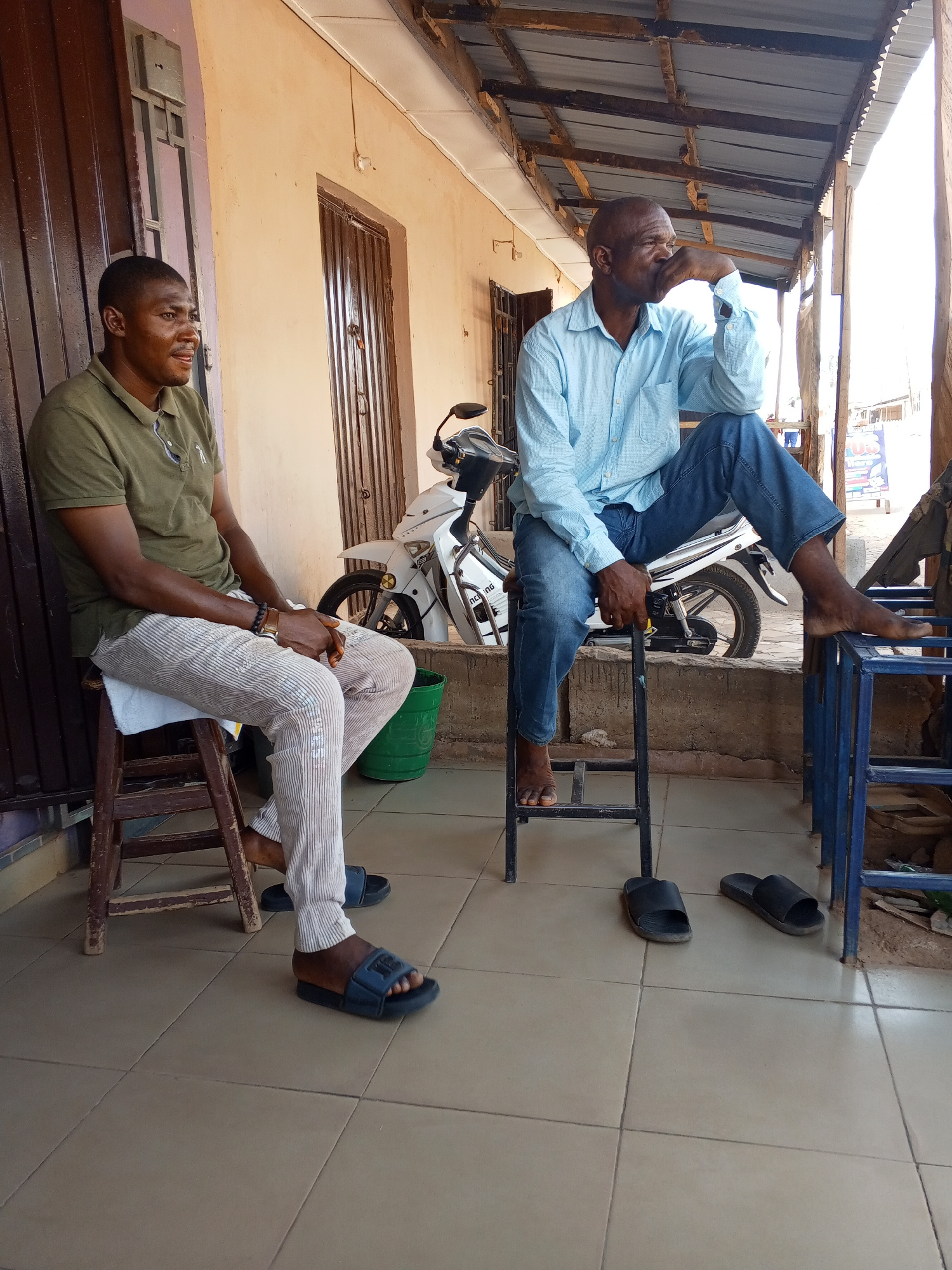 Two African men are seated outside a building in Sabon Tasha, Nigeria. One man, wearing a green polo shirt and striped pants, sits on a wooden stool, looking off to the left. The other man, dressed in…read more