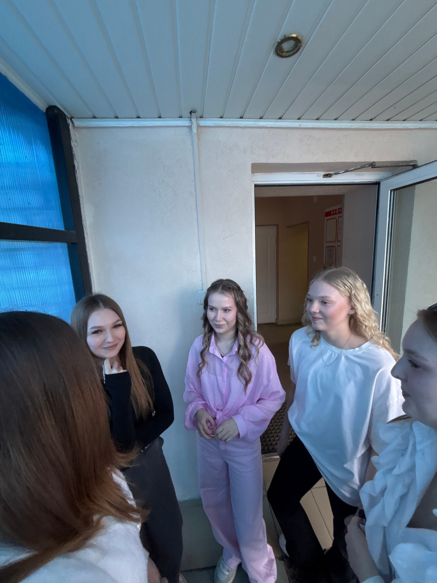 Five young females are gathered in an indoor common area or hallway in a building located in Foki, Russia. From left, a female with long brown hair in a black long-sleeved top and dark pants smiles wi…read more