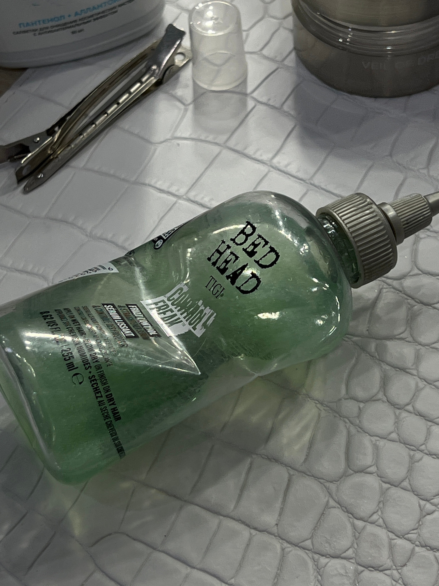 The image presents a close-up, overhead view of hair care products and styling tools arranged on a textured, light grey surface resembling crocodile skin. The central focus is a transparent, light gr…read more