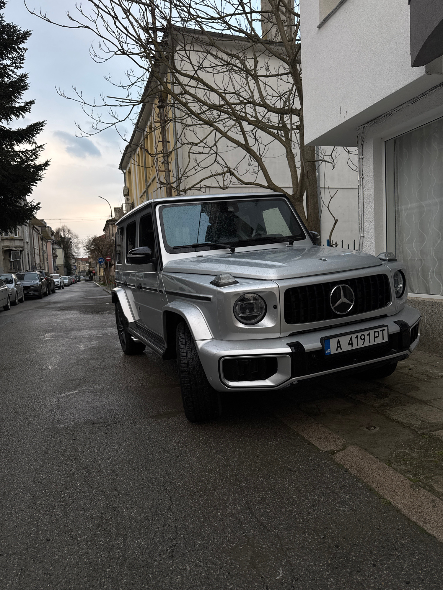 A silver Mercedes-Benz G-Class SUV is parked on the side of a wet asphalt street in Burgas, Bulgaria. The car's license plate reads "A 4191 PT" with "BG" for Bulgaria visible. The vehicle is parked cl…read more