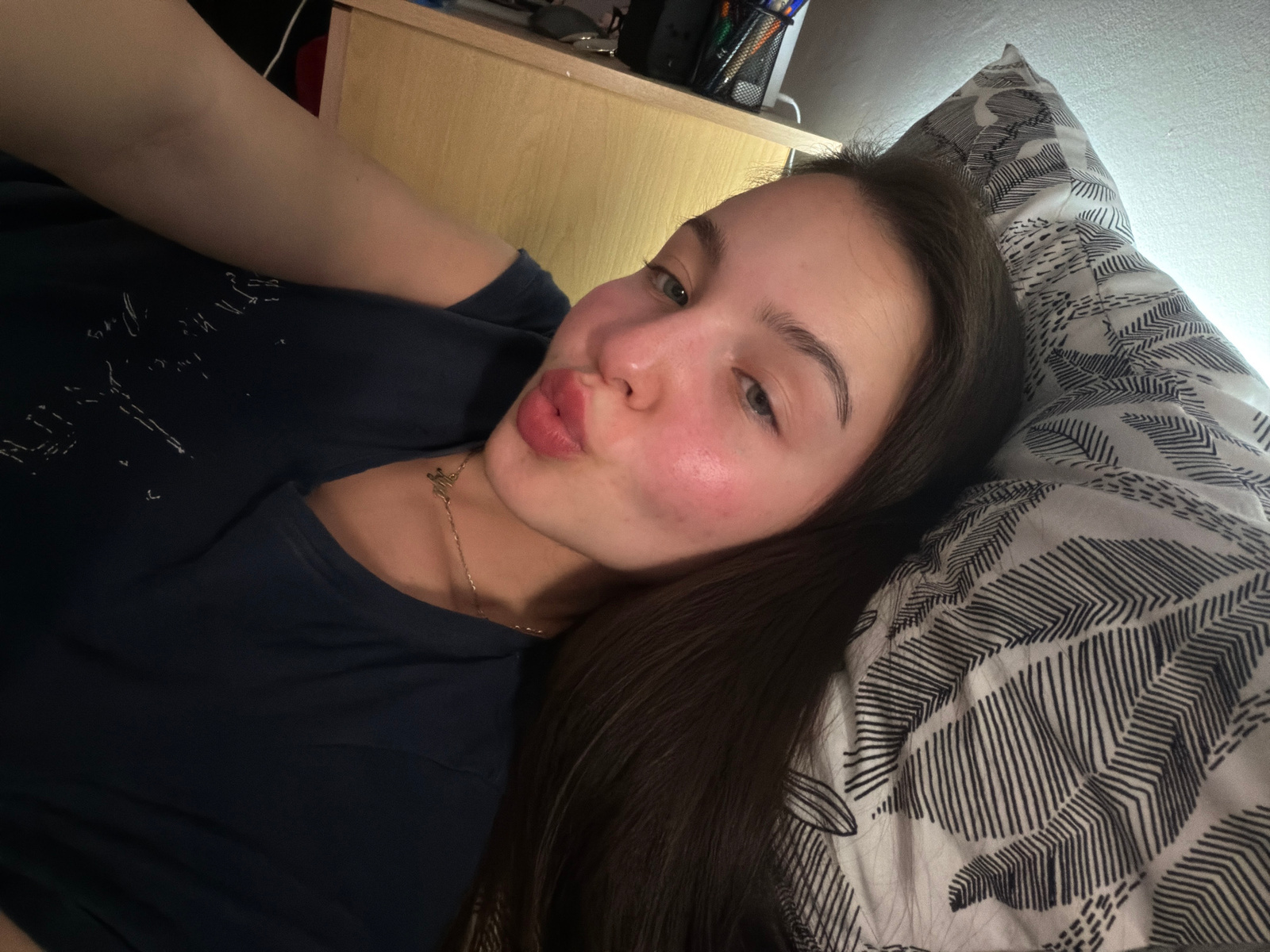 A young woman is lying on her back on a bed with a patterned pillow. She is wearing a dark blue shirt and a gold necklace. She is looking at the camera with her lips pursed. The background is a wall a…read more