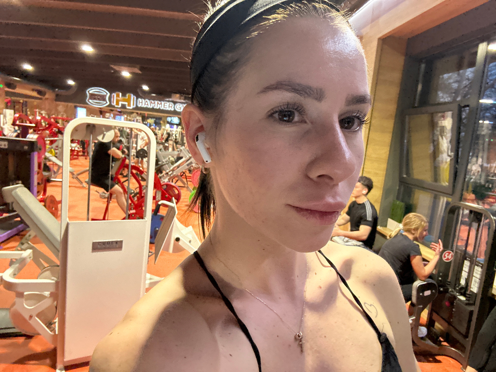 The image is a selfie taken in what appears to be a gym, likely in the city of Plovdiv, Bulgaria. Subject: A woman is prominently featured, wearing a black headband and what seems to be workout attir…read more