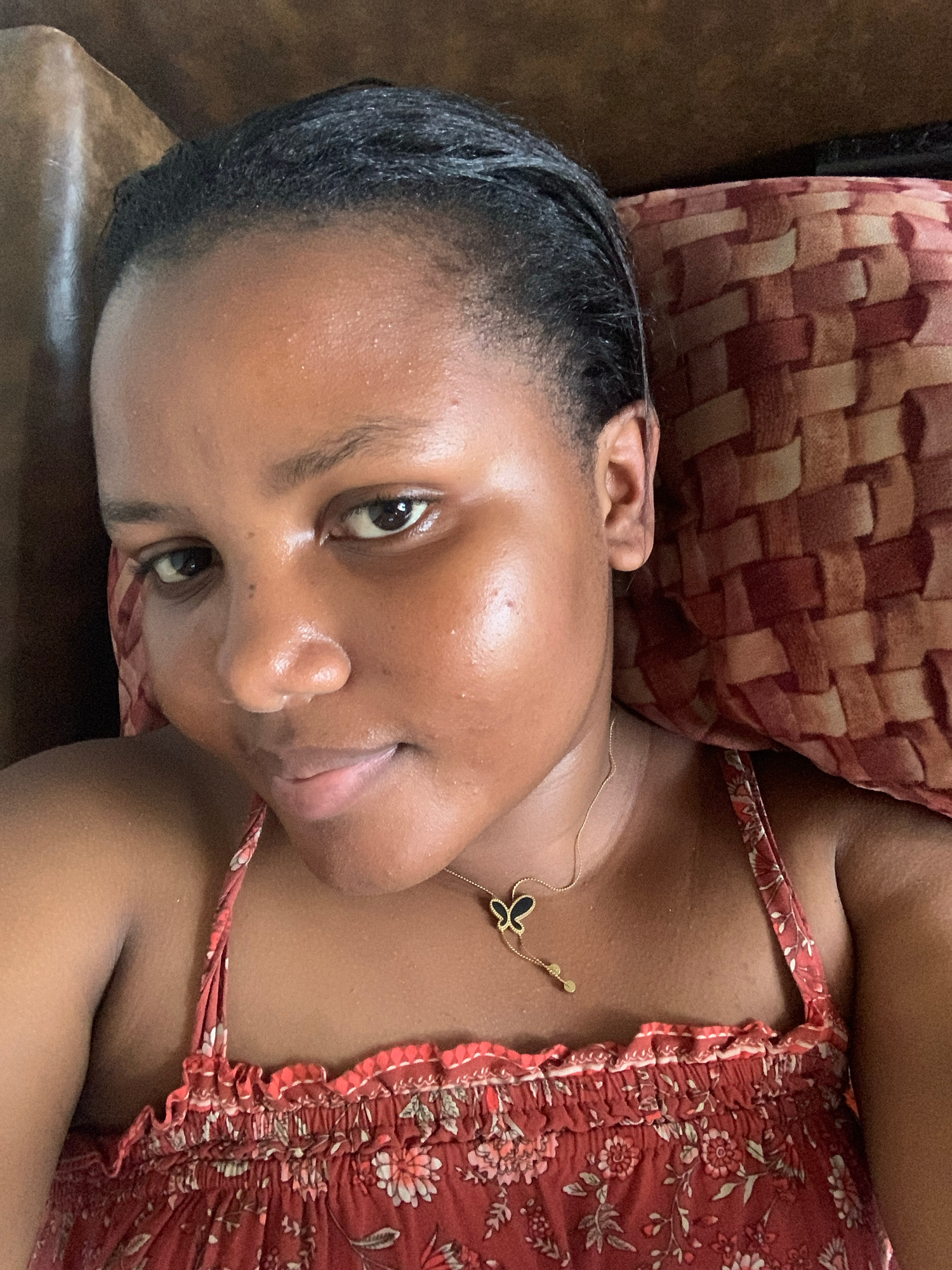 A close-up, tilted-angle shot shows a woman with dark hair and brown skin lying down. She is wearing a red floral-patterned top with thin straps and a gold necklace with a butterfly pendant. Her head…read more