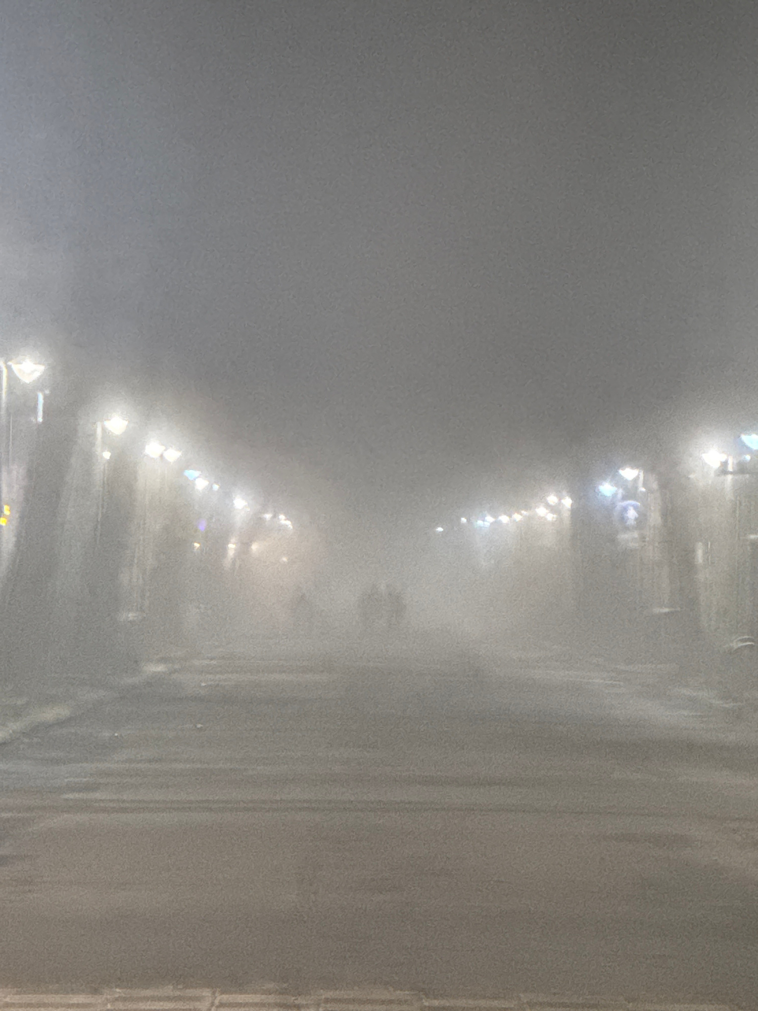 The image depicts a street scene in Burgas, Bulgaria, obscured by heavy fog. Streetlights are visible, illuminating the fog and indicating the presence of a road running along the right side of the im…read more