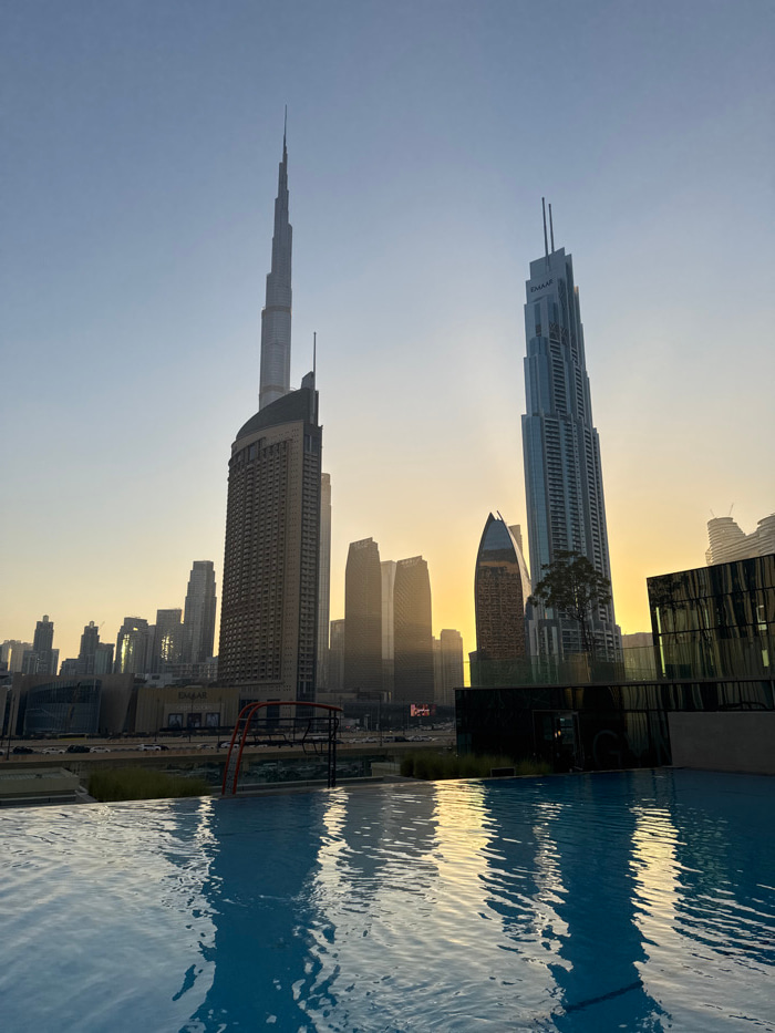 The image displays a panoramic view of the Downtown Dubai skyline in the United Arab Emirates, observed from an elevated perspective, likely a rooftop pool deck. The scene is bathed in the warm, golde…read more