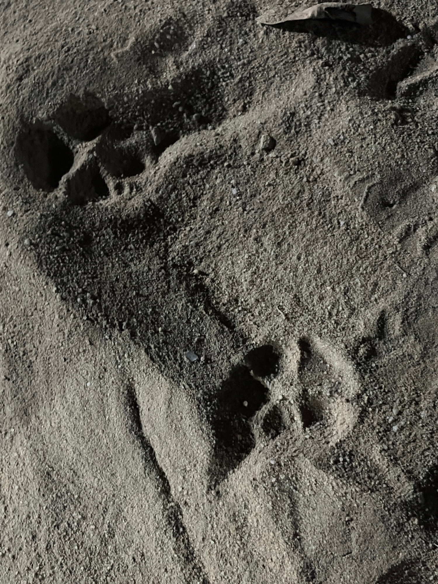 The image depicts two sets of paw prints in sand or dirt. One set is located on the lower left, and the other is on the upper right of the frame. A leaf or similar object is visible on the upper left…read more
