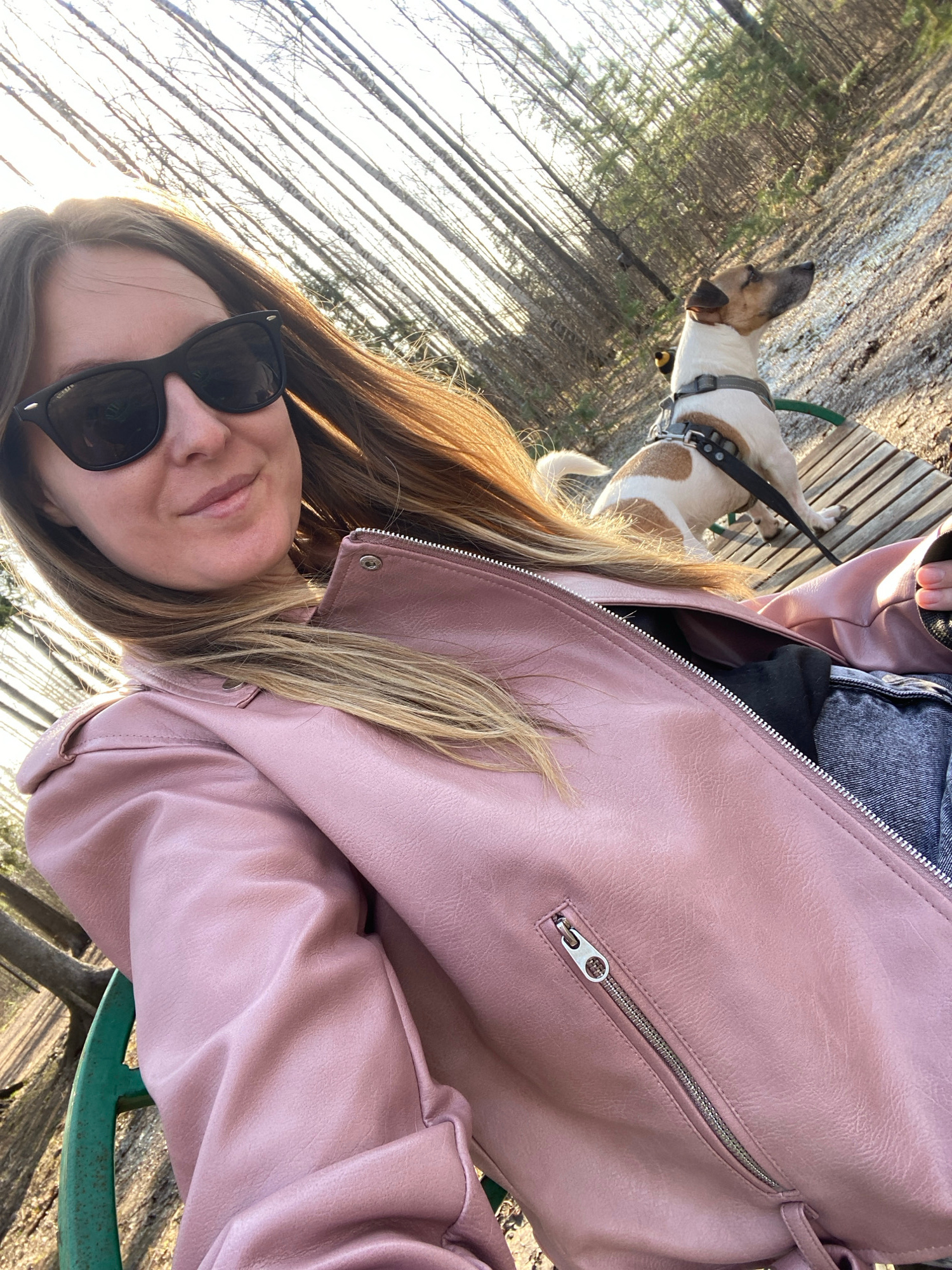 The image shows a woman seated on a park bench next to her dog. She is wearing sunglasses and a pink jacket. Her dog is small, white, and tan and is leashed. The location is a wooded park with tall, b…read more