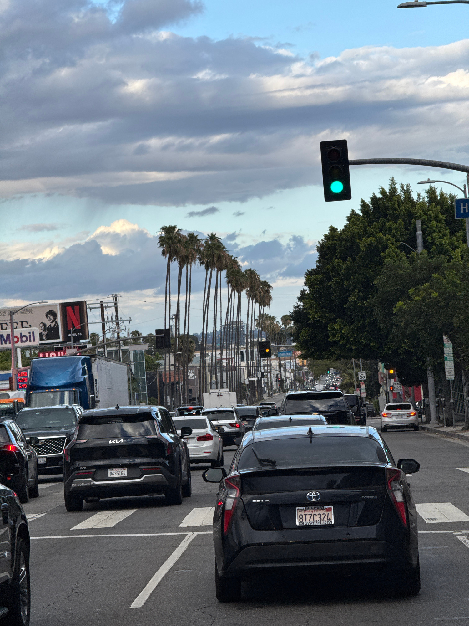 The image shows a street scene in Los Angeles, United States of America, characterized by heavy traffic congestion. The view is oriented along a street lined with palm trees. Several vehicles are visi…read more
