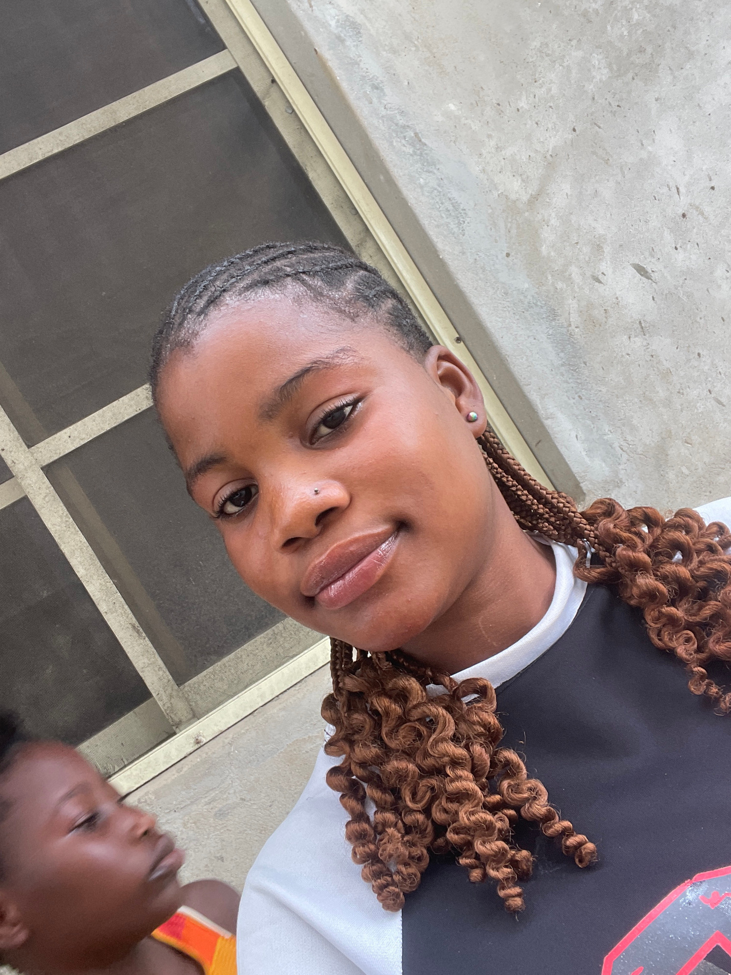 The image presents a close-up portrait of a young person, likely a teenager or young adult, in an outdoor or semi-outdoor setting in Badagry, Nigeria. The main subject has brown skin, dark eyes, and a…read more
