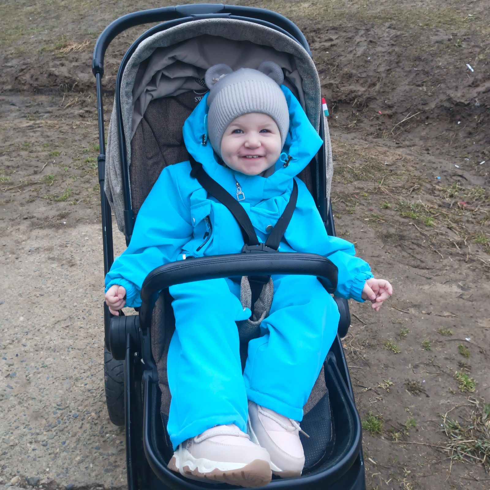 A young child is seated in a black stroller, smiling, against a backdrop of a muddy, unpaved area with some sparse vegetation. The child is wearing a bright blue snowsuit, a gray knit hat with bear ea…read more