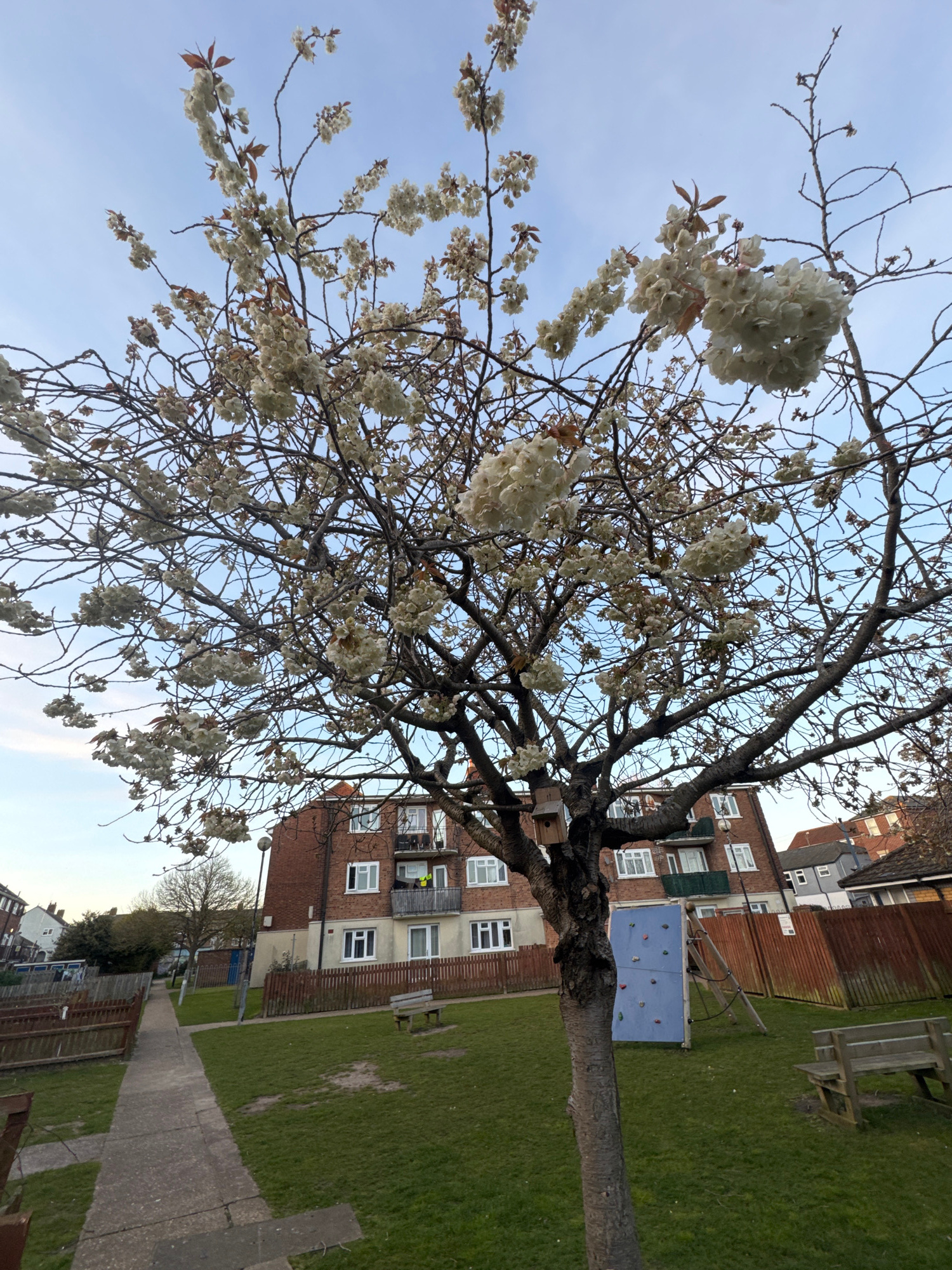The image depicts a tree in bloom with white flowers in a grassy area, likely a park or communal garden, in Gorleston-on-Sea, United Kingdom. Behind the tree, there is a multi-story brick building wit…read more