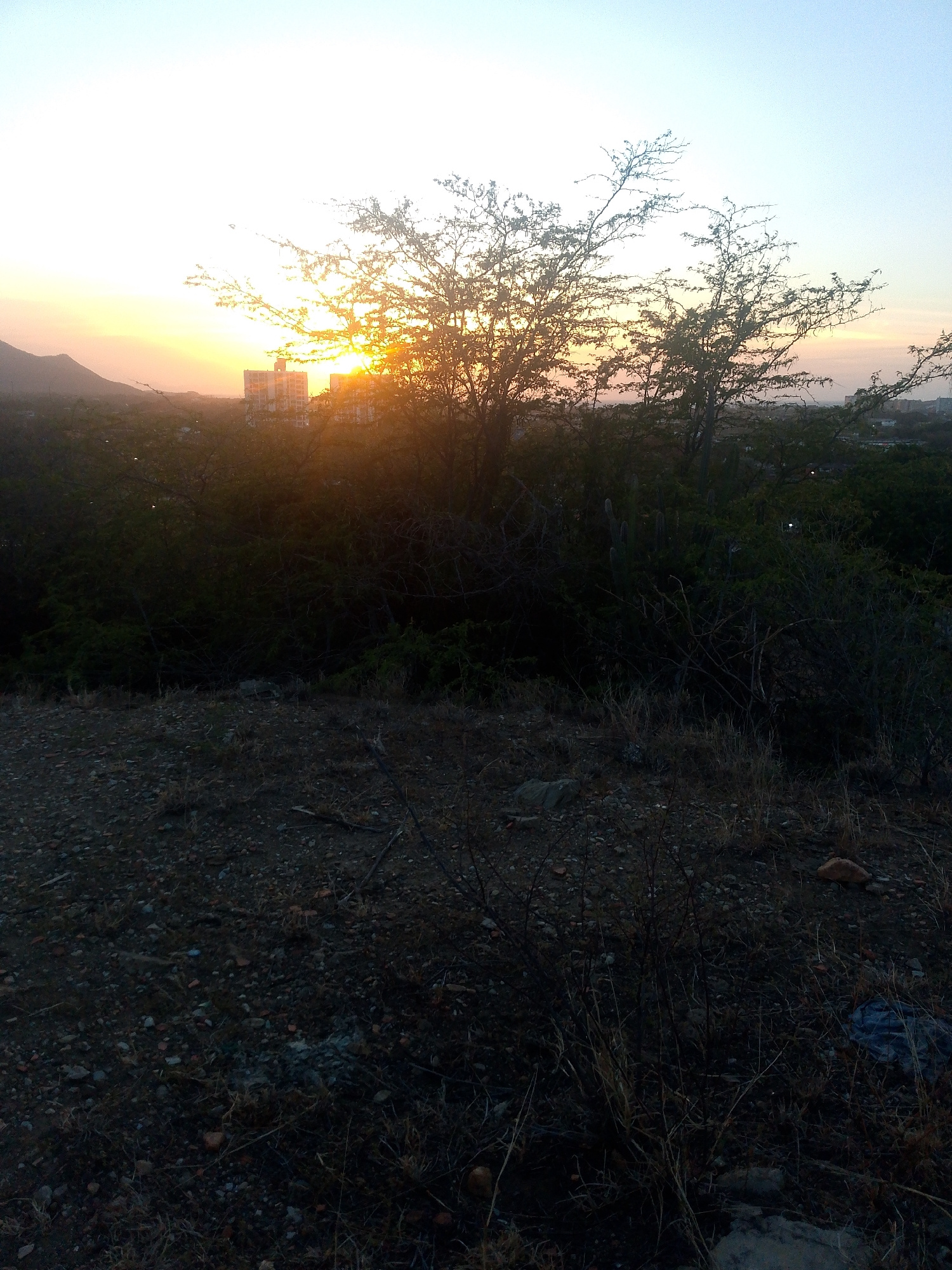 The image depicts a sunset over the city of Juan Griego, Venezuela, as viewed from an elevated position. The foreground is composed of dark, rocky soil and sparse vegetation. In the midground, there a…read more