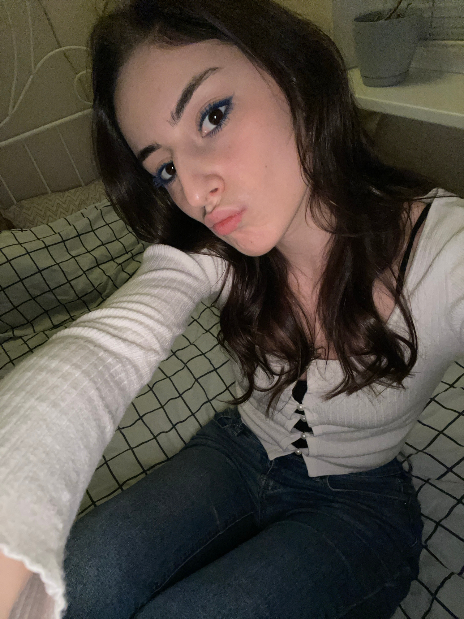 The image shows a young woman lying on a bed with a patterned blanket, possibly in a residential setting. She has dark hair and is wearing blue eyeliner. She is wearing a white top with pearl details…read more