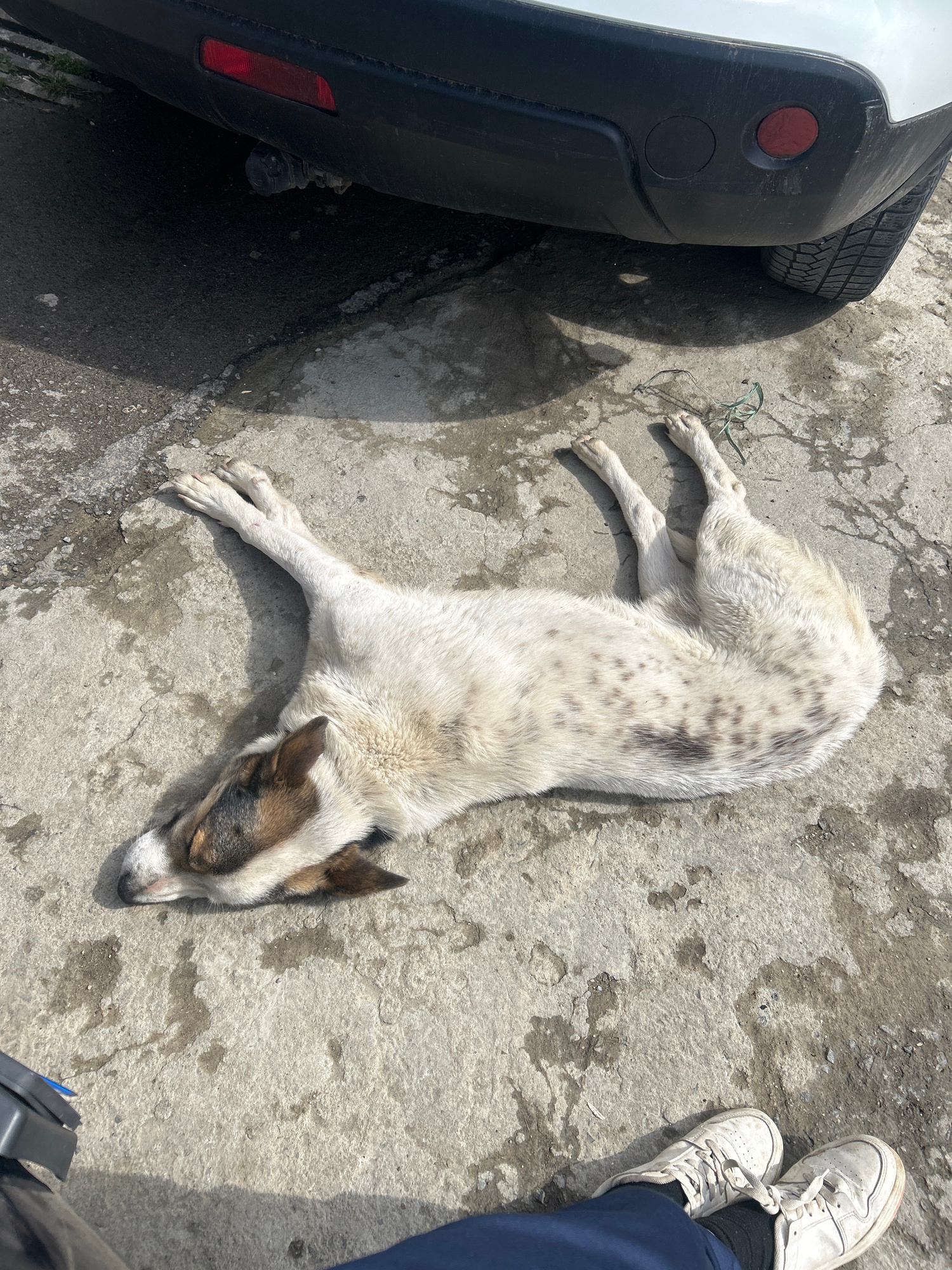The image shows a dog lying on a concrete surface, next to a car in Tsarevo, Bulgaria. The dog is medium-sized, primarily white with dark brown markings on its head and dark spots on its back. The dog…read more