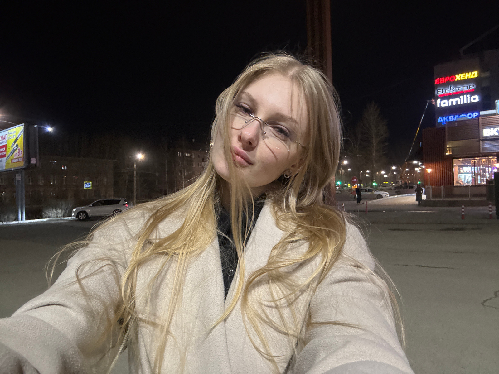 A young woman with blonde hair is shown in an upside-down outdoor selfie. She is wearing glasses and a light-colored coat. The background is dark, indicating nighttime, with illuminated signs in Russi…read more