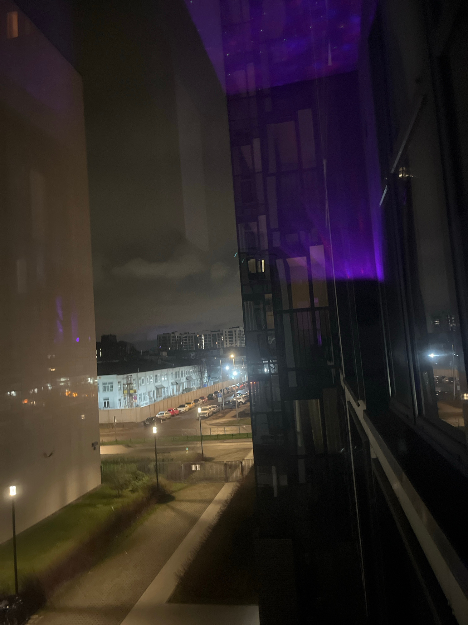 Captured through a window, the image reveals a night scene in Saint Petersburg, Russia. The window frame is partially visible at the top and sides of the shot. Through the window, the outside world is…read more