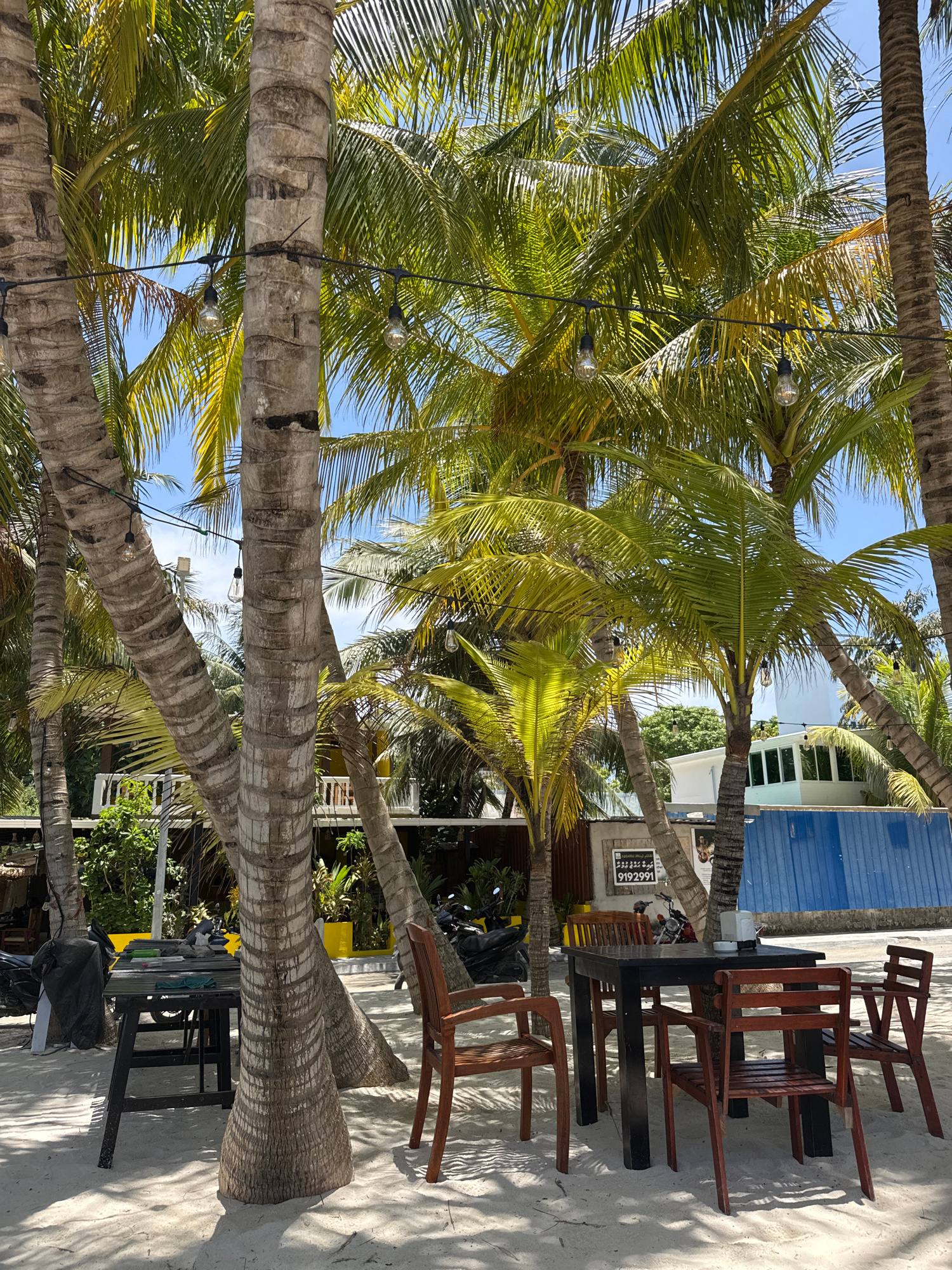 The image depicts a beachfront scene in Ukulhas, Maldives, featuring several coconut palm trees with their trunks aligned along the edge of the sandy beach. String lights hang between the palm trees.…read more