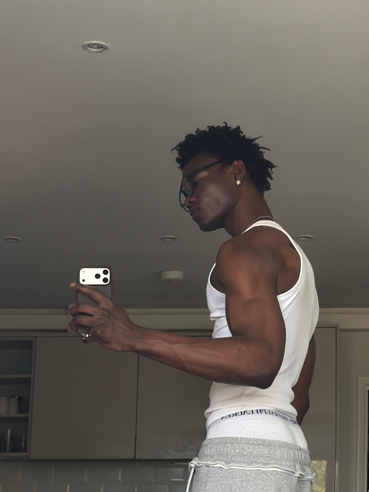 A person with dark skin, short dark curly hair, and glasses is depicted taking a mirror selfie indoors. They are wearing a white tank top and grey sweatpants, revealing a muscular physique in their ar…read more
