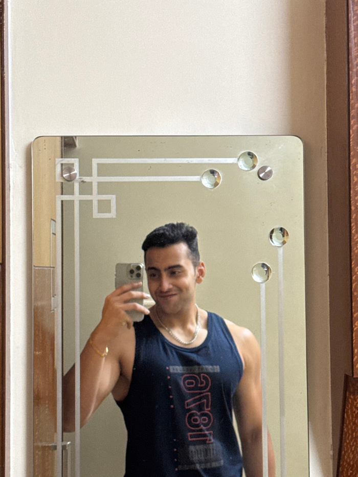 The image is a mirror selfie taken indoors by a man. The central focus is the man's reflection in a rectangular mirror, which is mounted on a plain, light-colored wall. A wooden frame is visible at th…read more