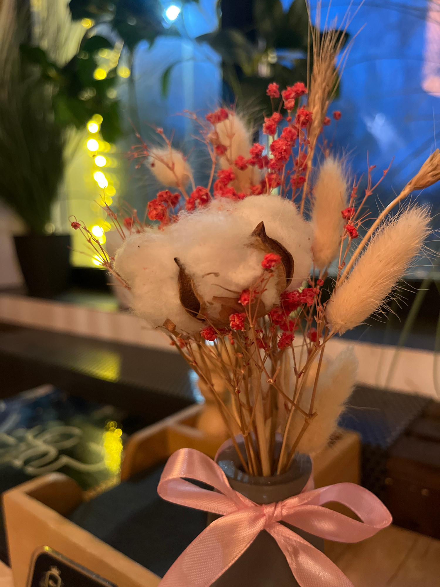 The image displays a close-up, vertically oriented shot of a decorative dried flower and cotton bouquet, set against a soft, out-of-focus background. The bouquet is the primary subject, held within a…read more