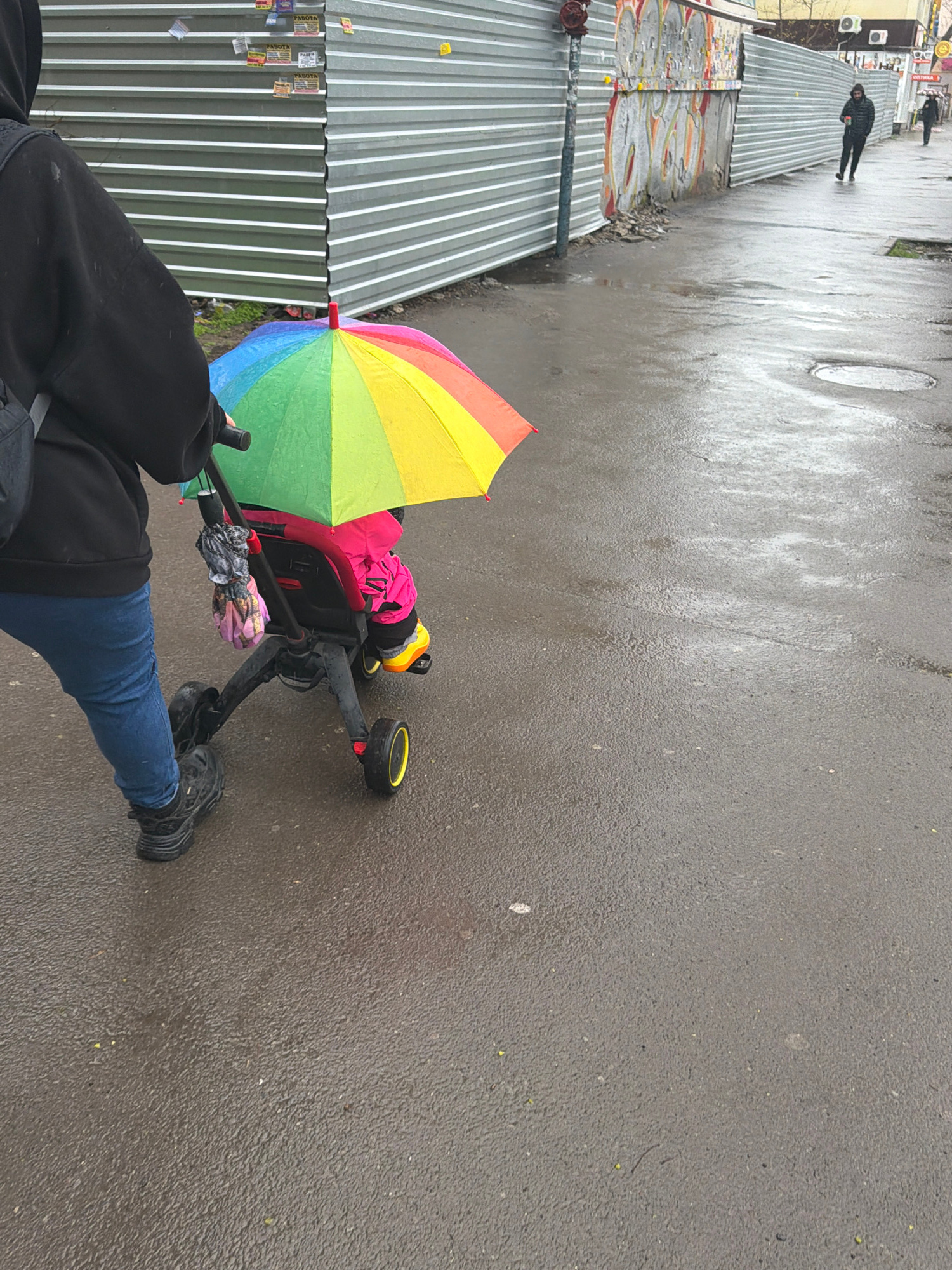 The image shows a person walking in the rain on a wet, asphalt street in what is likely Rostov-on-Don, Russia. The person is pushing a baby stroller covered by a rainbow umbrella. The person is wearin…read more