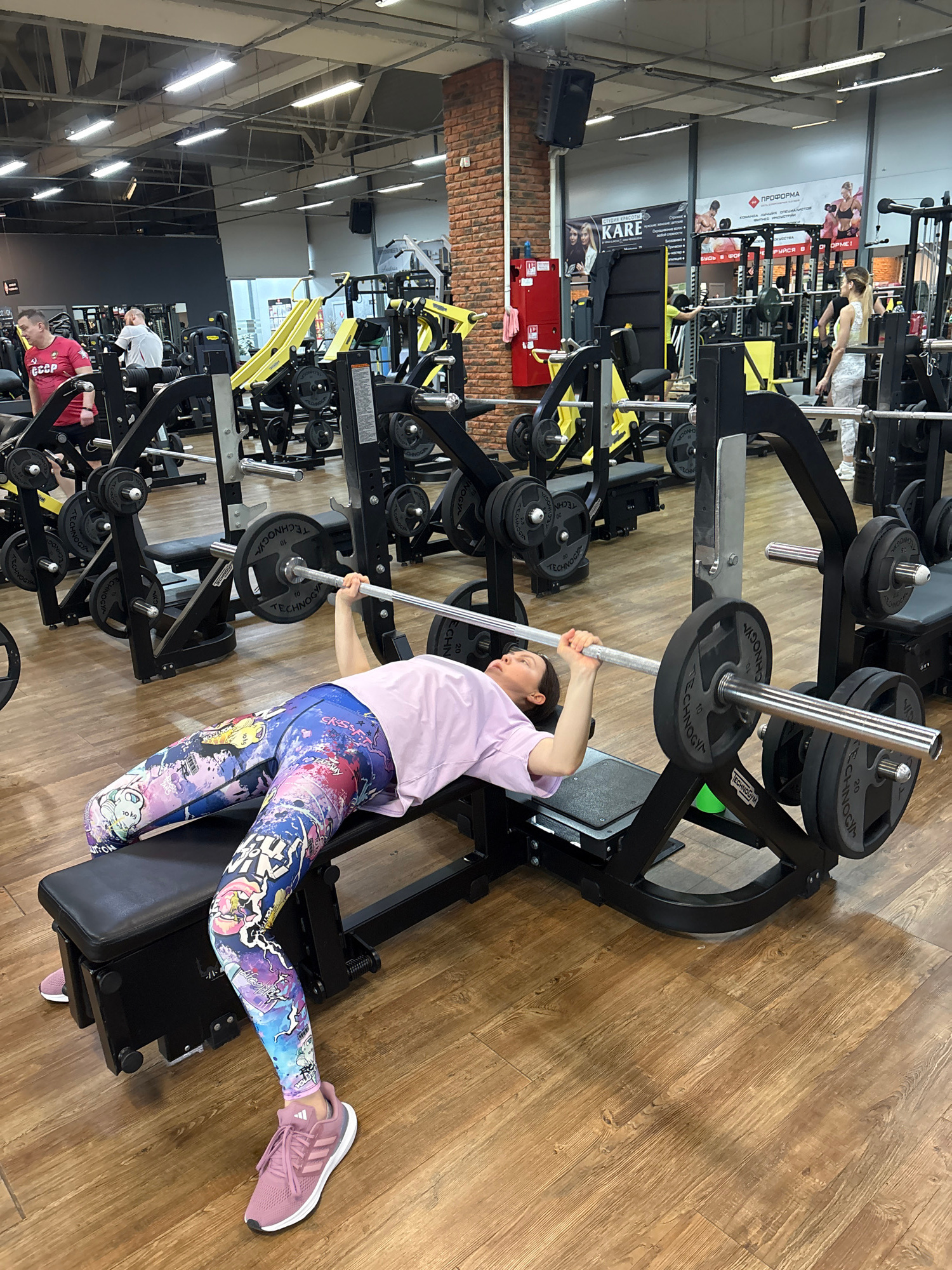A woman is working out at a gym in Chaikovsky, Russia. She is lying on her back on a workout bench, lifting a barbell with weights. The gym has wood floors and yellow and black workout machines, and t…read more