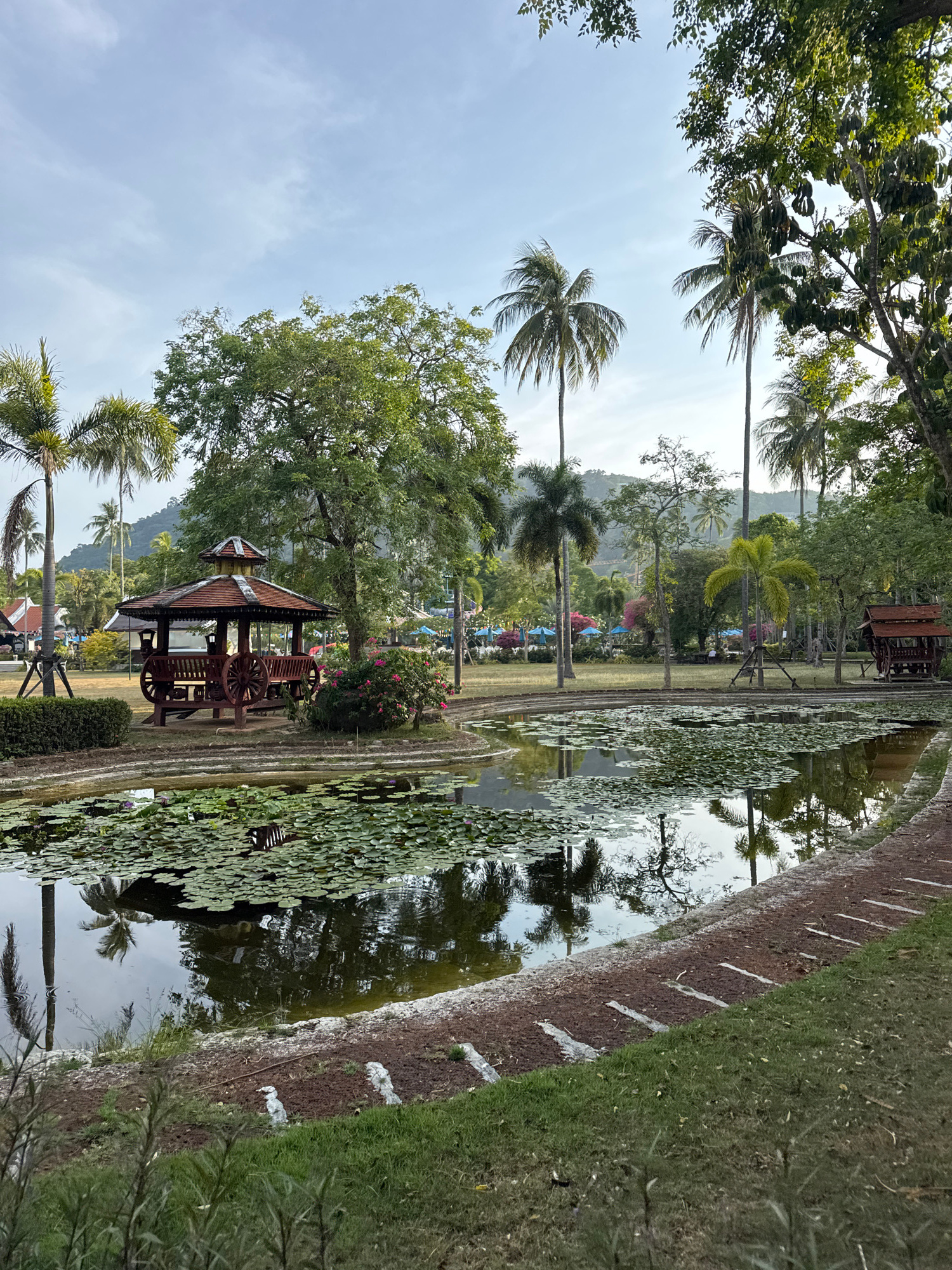 The image depicts a park scene in Patong, Thailand. A pond with lily pads dominates the foreground, reflecting the surrounding environment. A gazebo with wooden wagon wheels rests on the bank of the p…read more