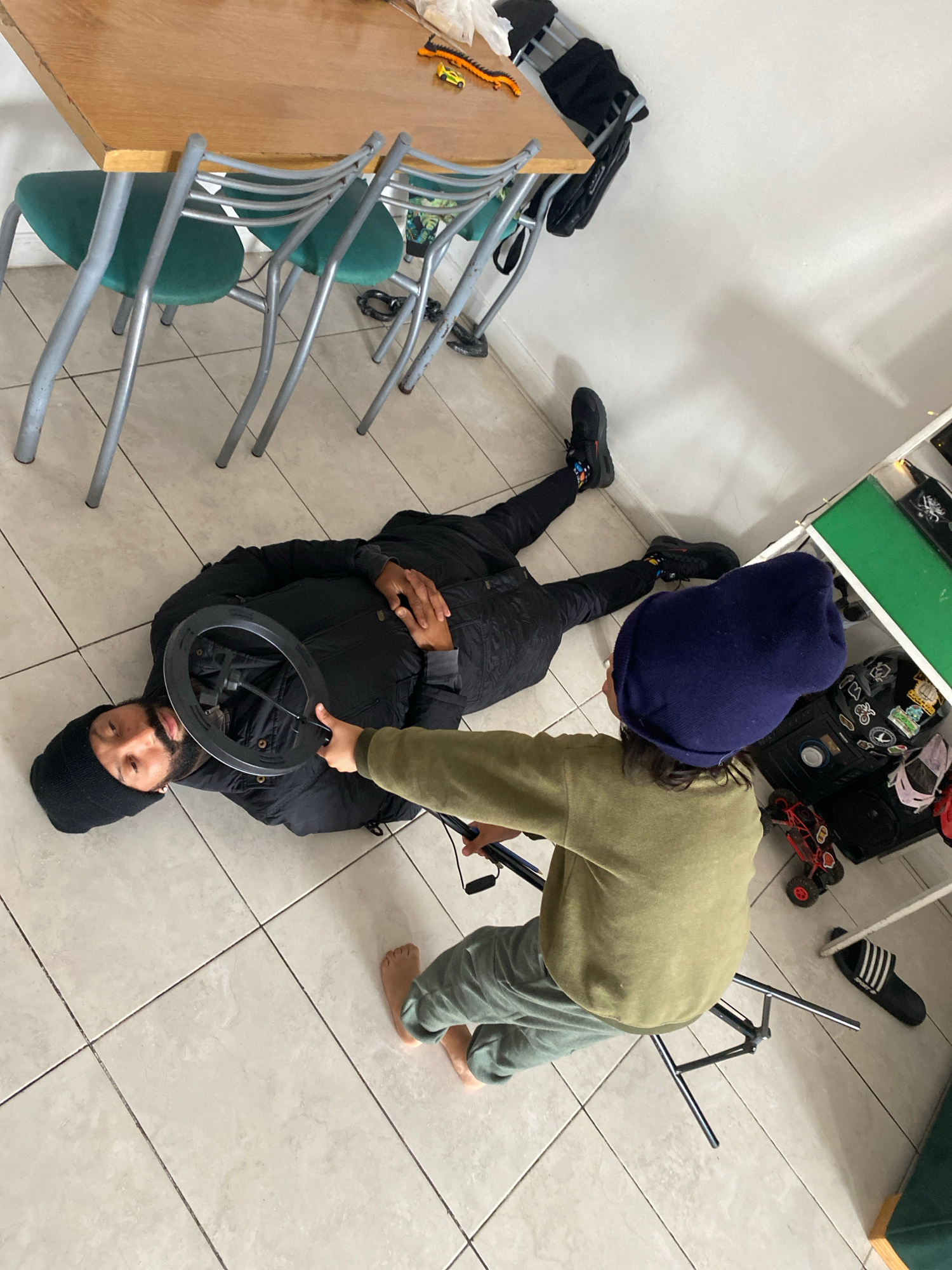A man wearing a black beanie and black jacket is lying on a tiled floor. A child, wearing a blue beanie, a green sweater, and green pants, is holding a ring light over the man's face. The scene is ind…read more