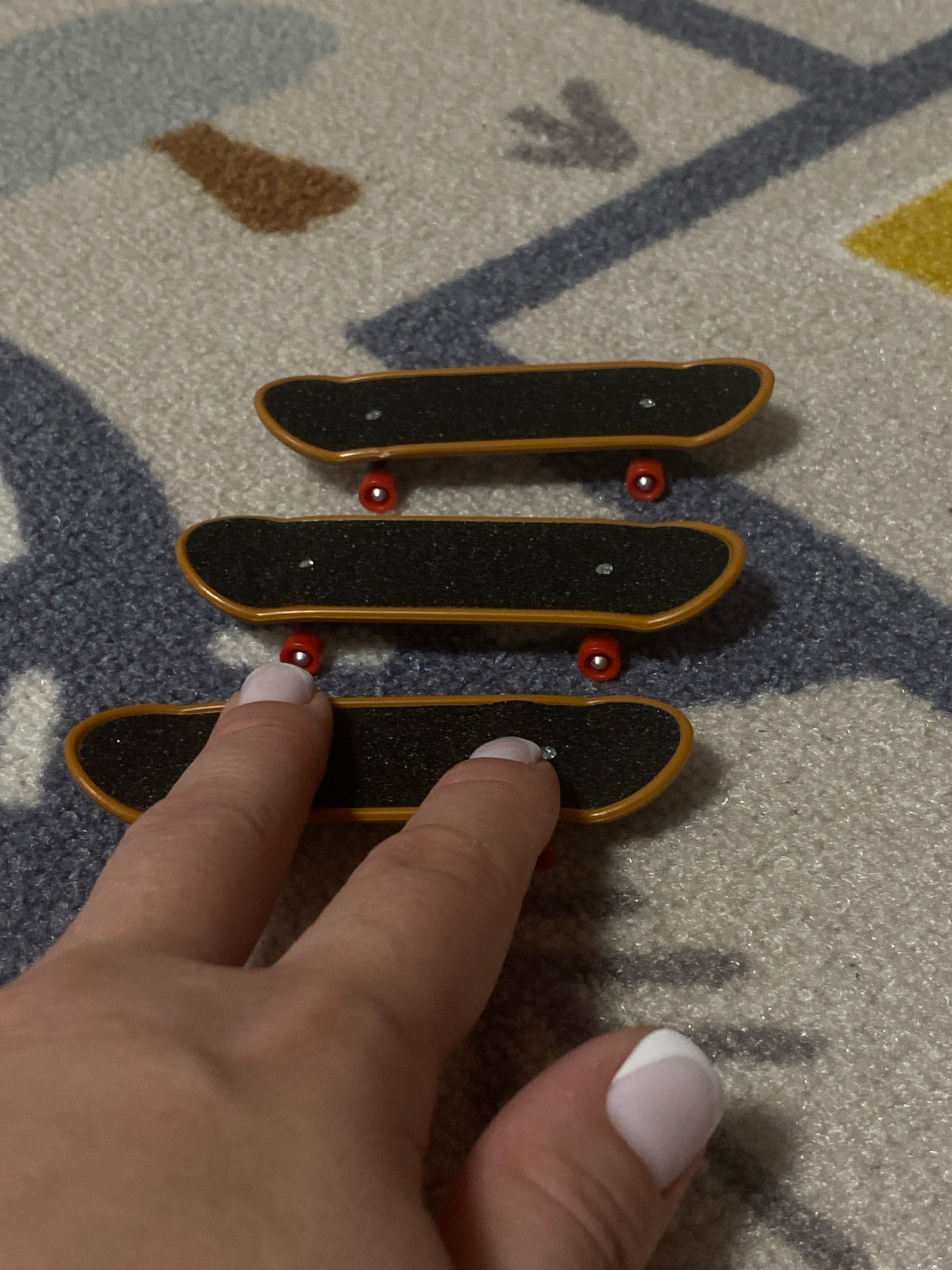 The image shows three miniature skateboards, commonly known as fingerboards, positioned in a row on a patterned carpet. A person's hand is visible, with a finger resting on one of the fingerboards. Th…read more