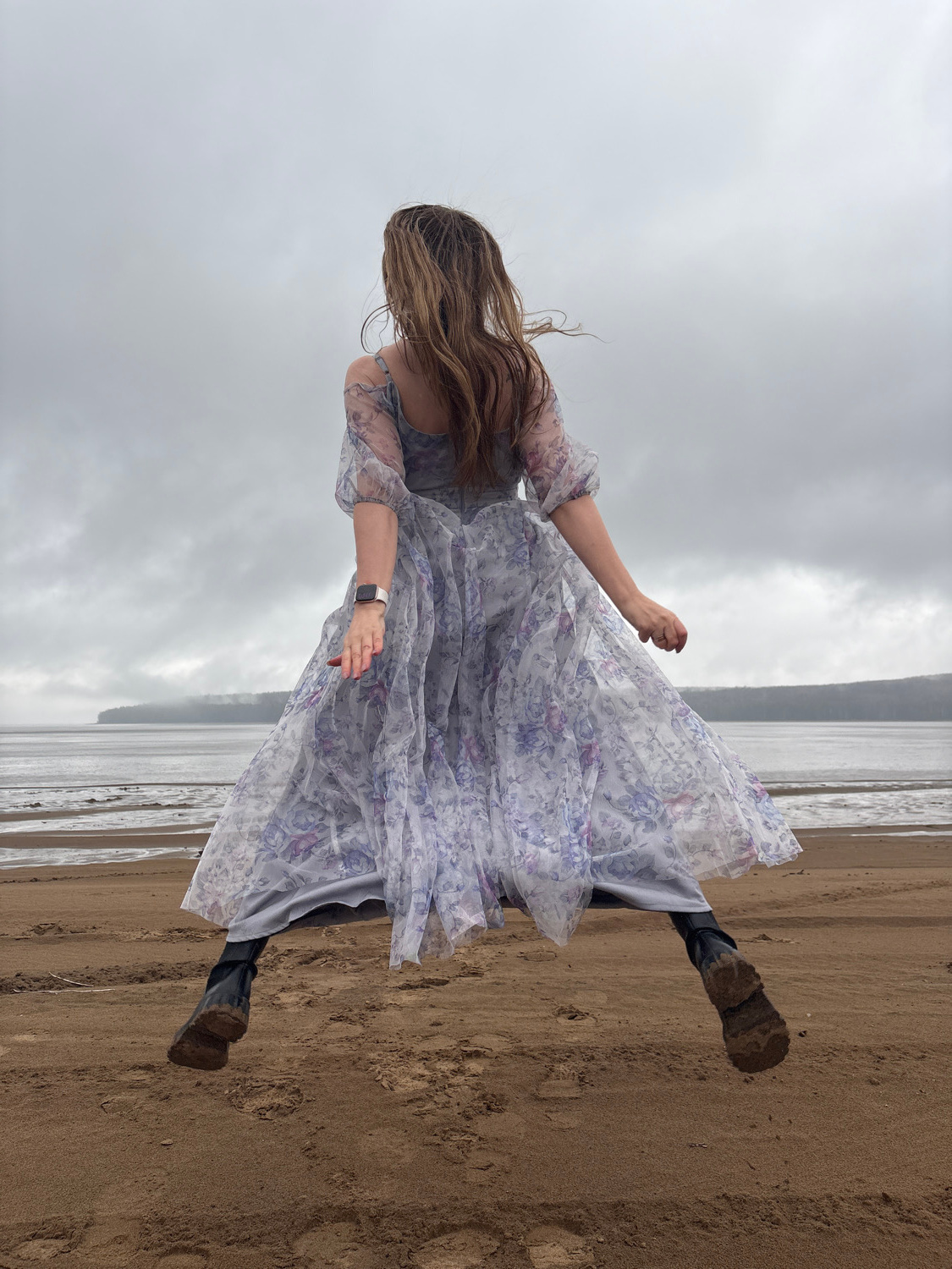 A woman is depicted from a slightly elevated perspective on a sandy beach in Chaikovsky, Russia, under an overcast sky. Her long, light brown hair flows in motion, partially obscuring her face as she…read more