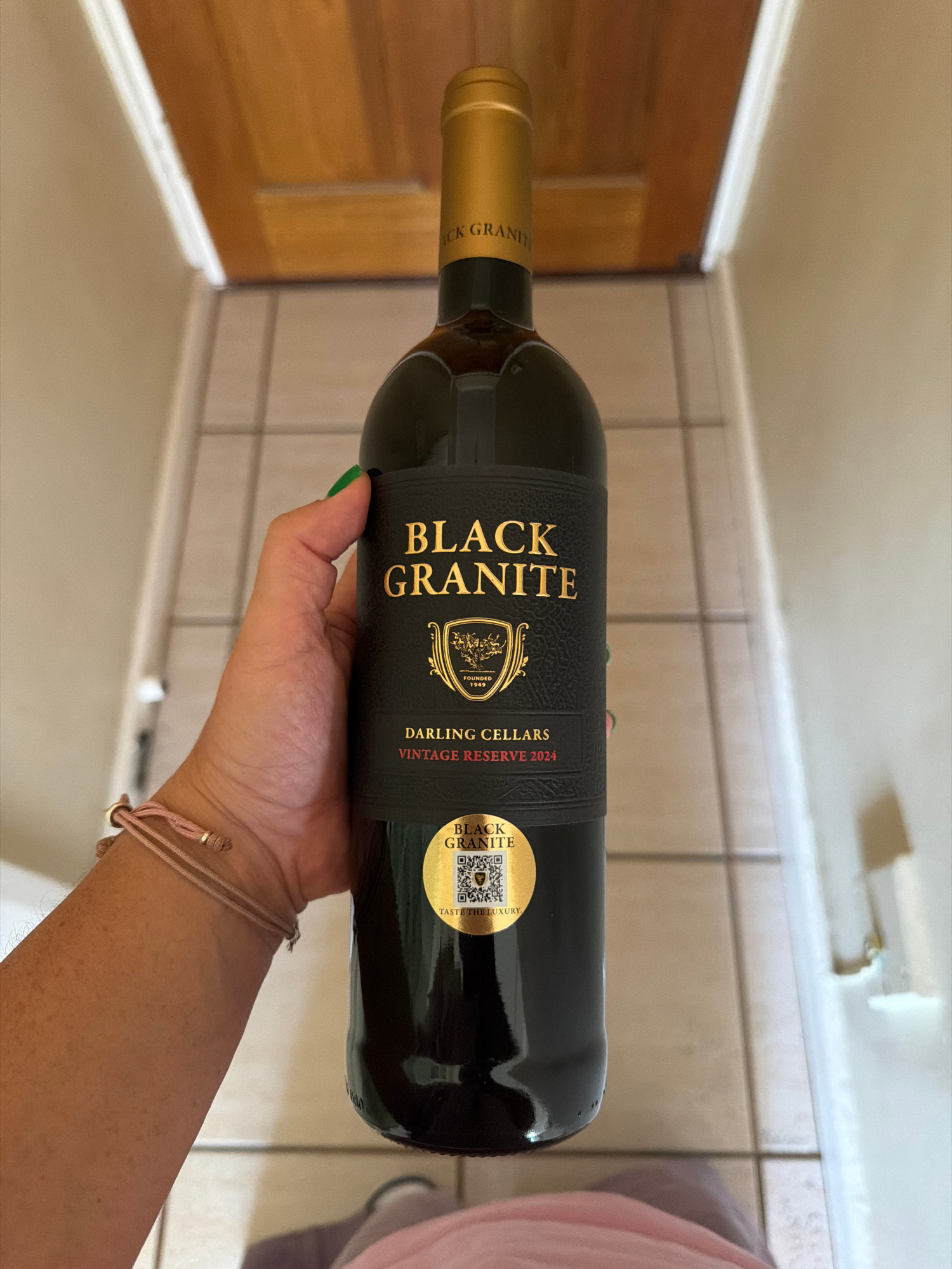 A person is holding a bottle of "Black Granite" red wine, a product of Darling Cellars, Vintage Reserve 2024. The bottle has a gold-colored cork and a black label with gold lettering. A gold sticker w…read more