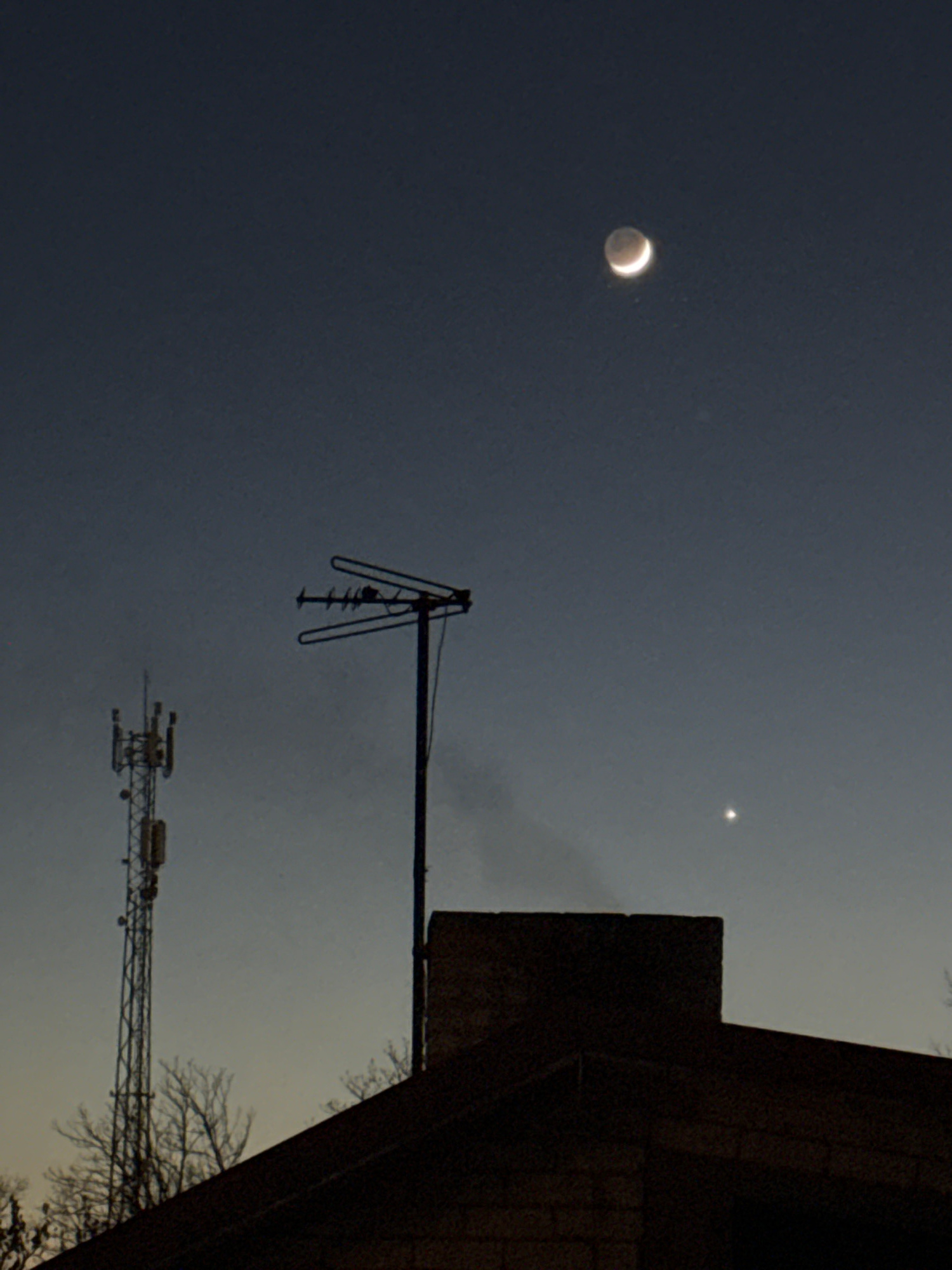 The image shows a night scene, likely in Carnikava, Latvia, but the exact location within the city is not identifiable from this image alone. The sky is a dark gray with a visible crescent moon and a…read more